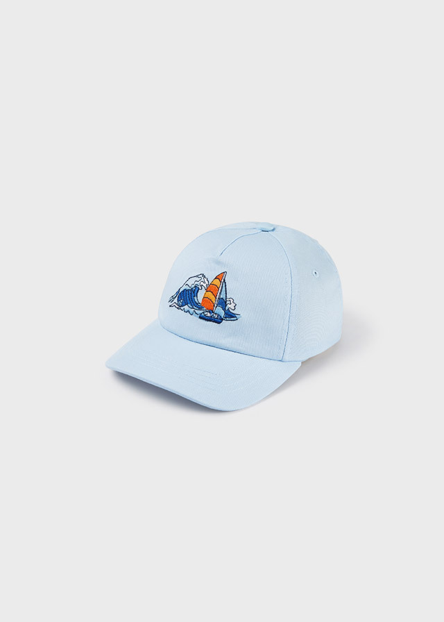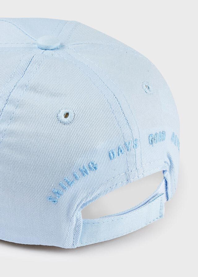 Красивая бейсболка небесного оттенкас вышитым рисунком отлично подойдетпод любой наряд. Кепка очень удобнаяи защитит мальчика от палящегосолнца.