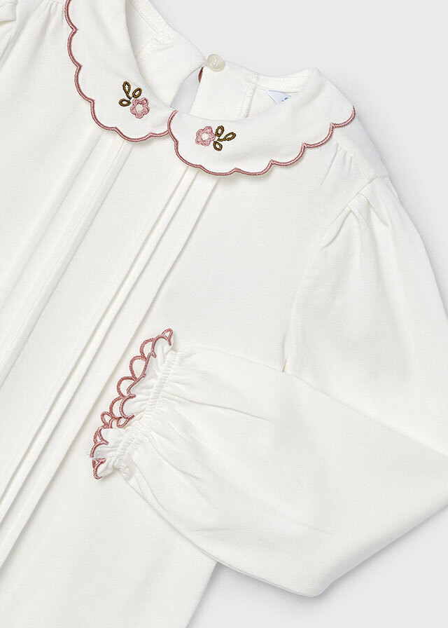 Легкая очень приятная к телу блузкас элегантной драпировкой и декорированнымиманжетами и воротником сделает изкаждой девочки настоящую леди.