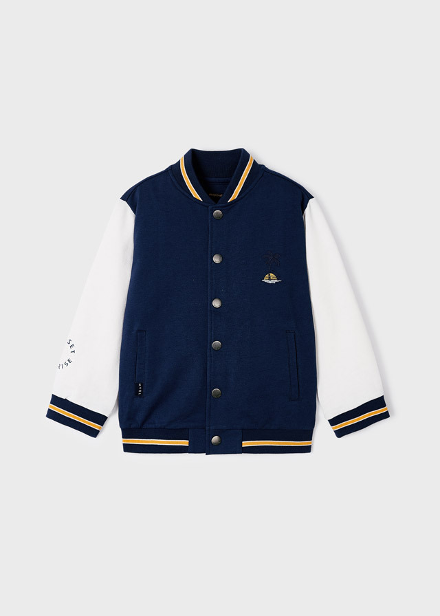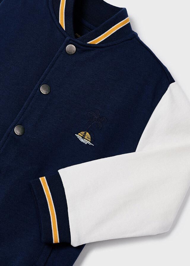Самый настоящий классический бомберв американском стиле темно-синегоцвета с белыми рукавами поможетдополнить одновременно и стиль CASUAL, и спортивный.