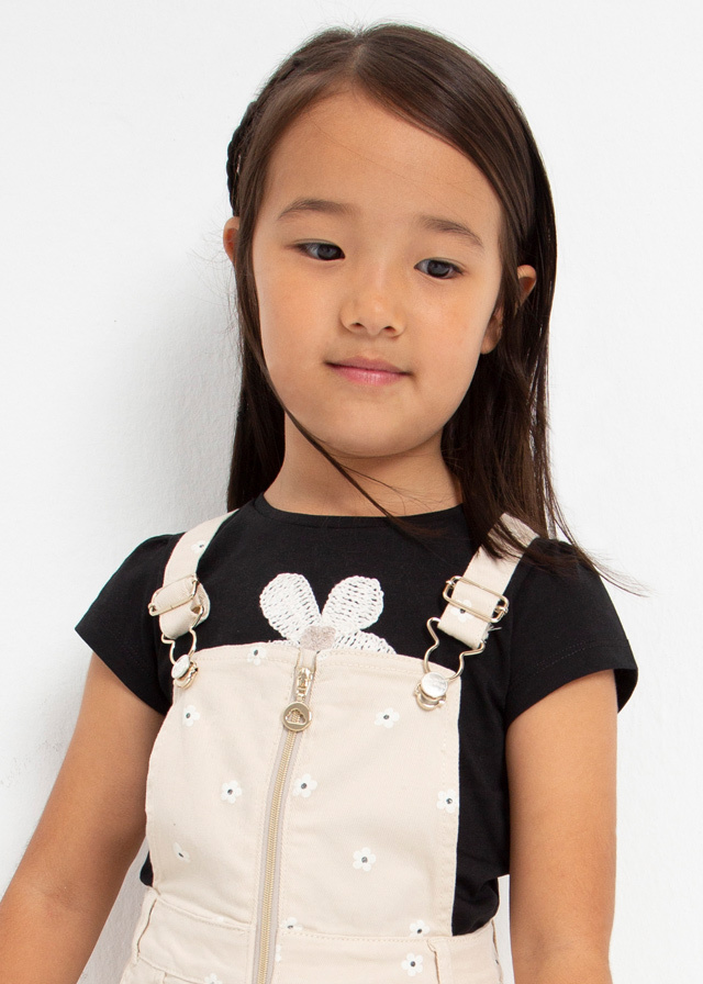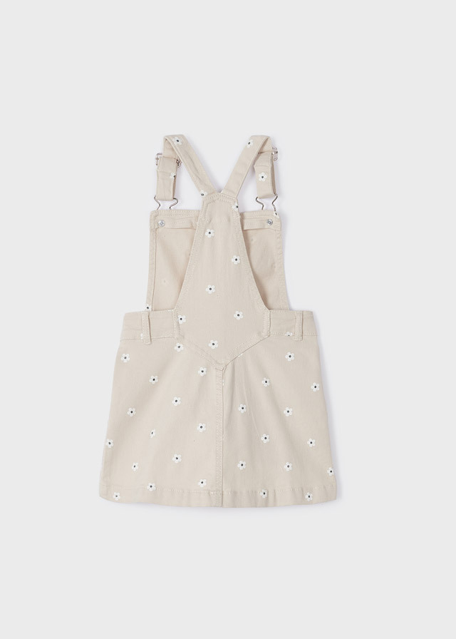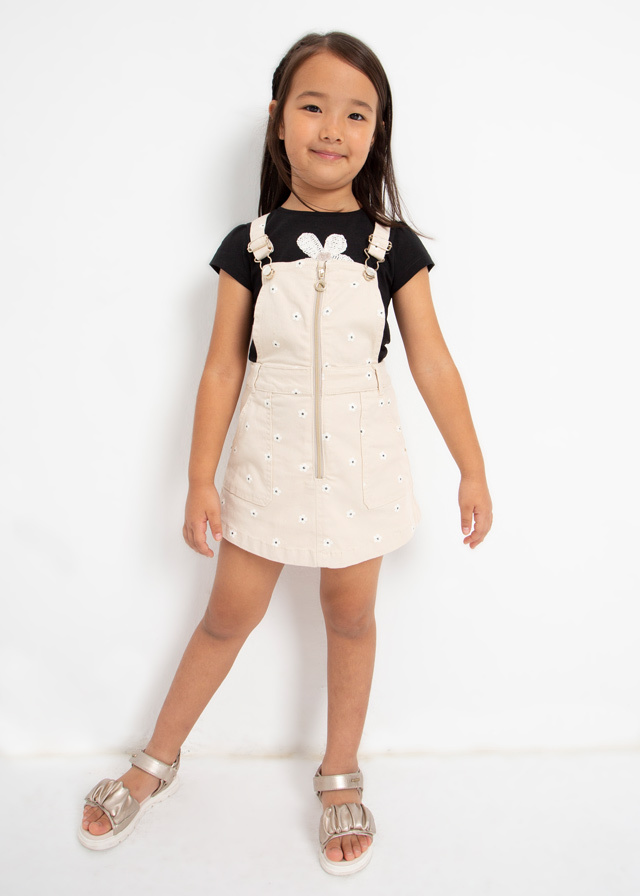 Милый и очень стильный джинсовыйсарафан бежевого цвета в мелкийцветочек очень удобный. В нем не будетжарко летом, а благодаря удобному крою,Ваша дочка не захочет его снимать.