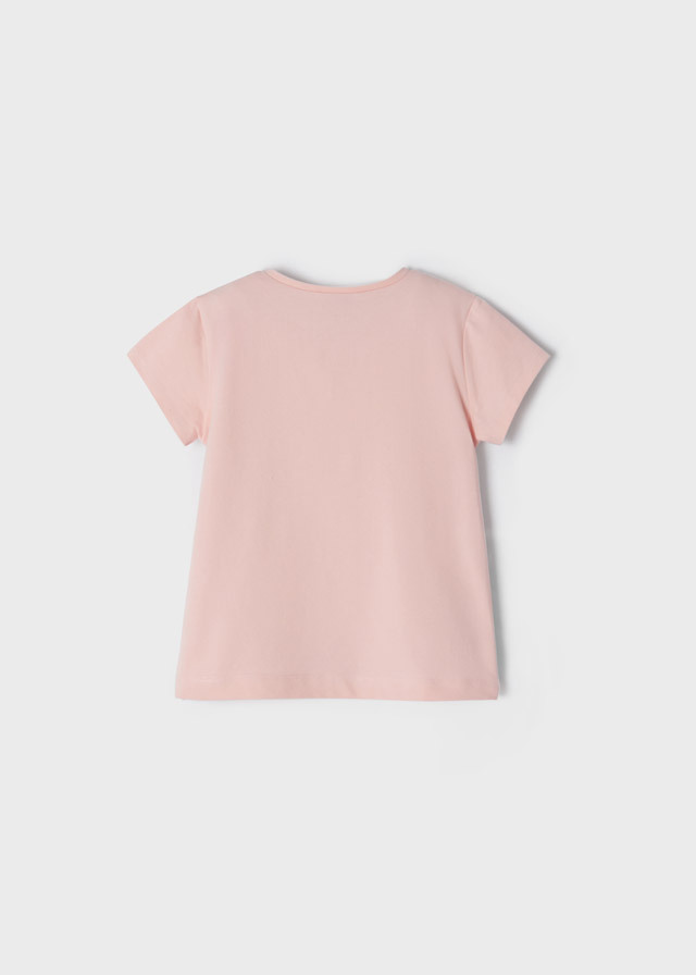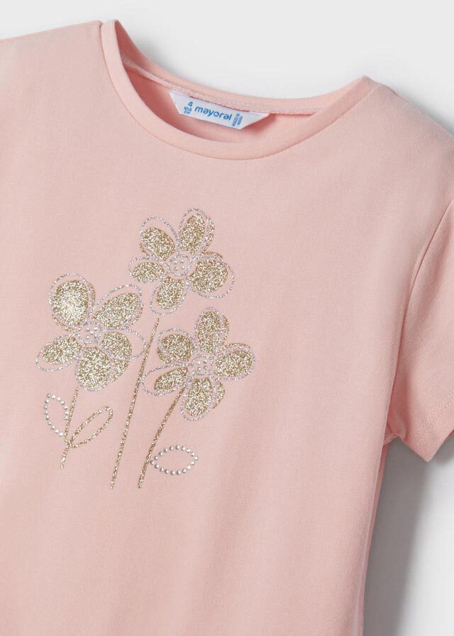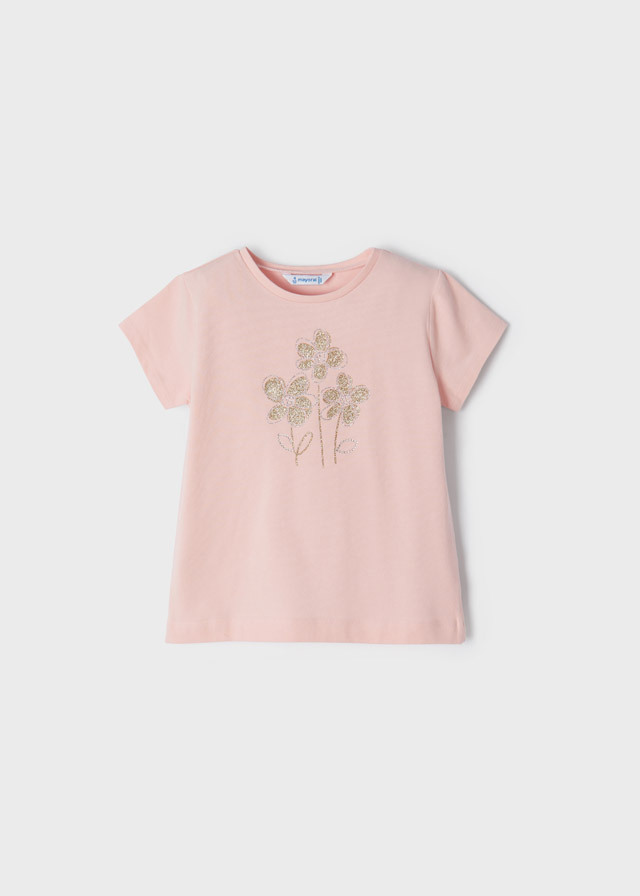 Футболка нежно-розового цвета срисунком цветочков прекрасноподойдет для любого времени года.Она станет незаменимой базовойвещью в гардеробе Вашей доченьки.