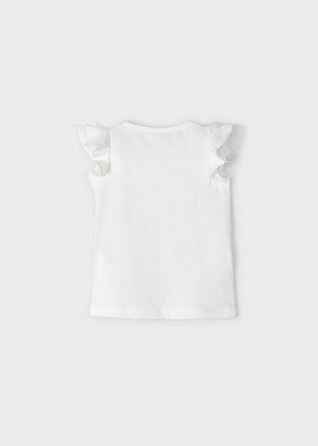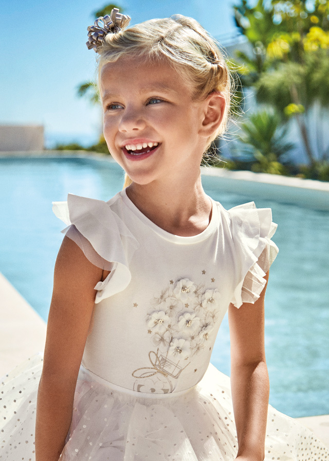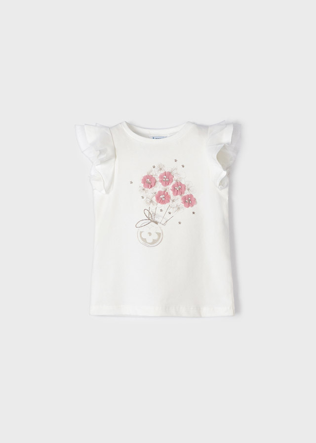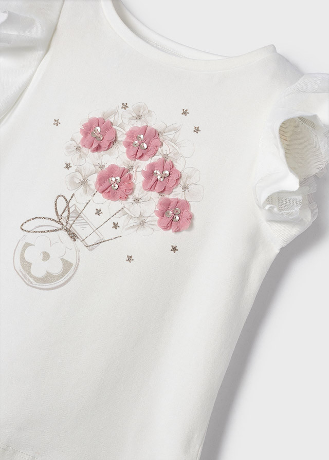 Прекрасная футболка белоснежногоцвета с фактурными алыми цветами ивоздушными рукавами очень понравитсяВашей дочке. Она будет выделятьсясреди подружек.