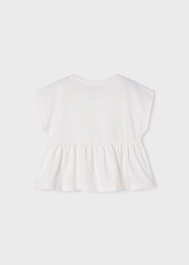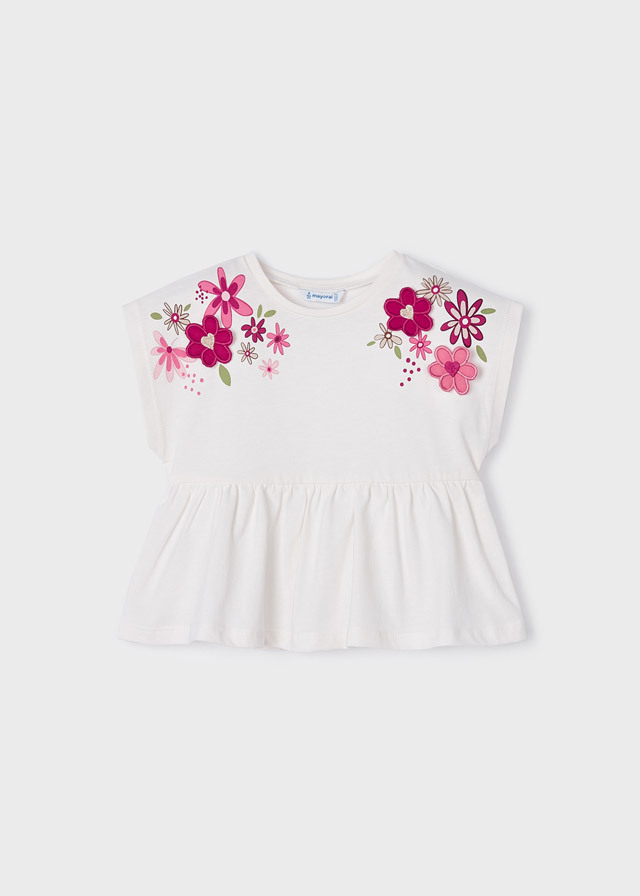Воздушный топ для девочекбелоснежного цвета с объемнымиалыми цветками сделают образ оченьмилым. Футболка свободный формыбудет отлично сочетаться с любымибрюками или шортами.