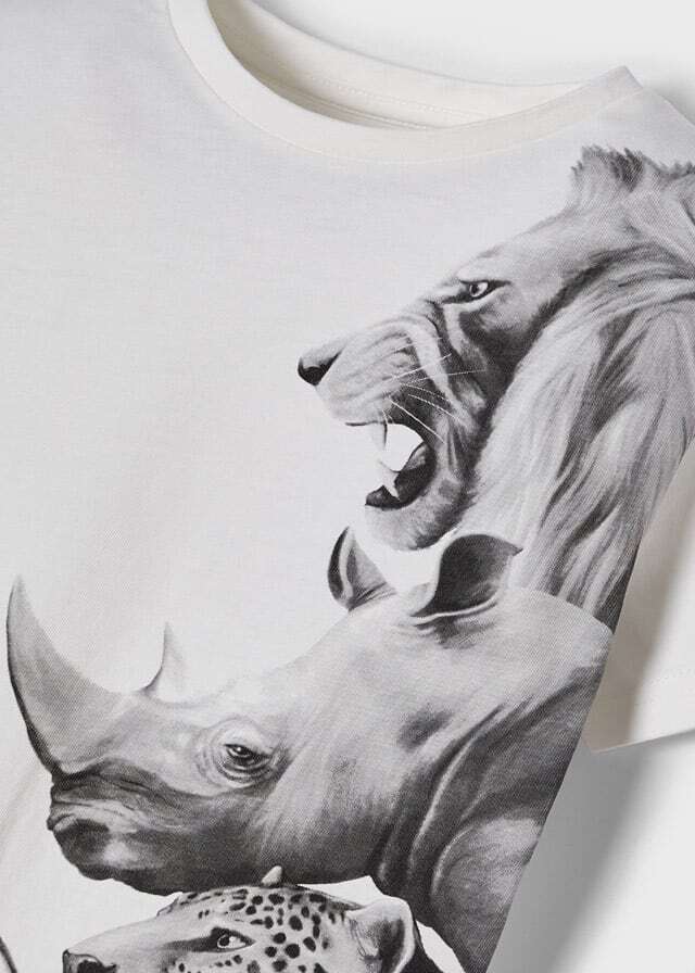 Футболка белого цвета с изображениемдиких животных обратит на себявнимание всех ребят вокруг. Вашемусыночку точно захочется такуюклассную футболку.