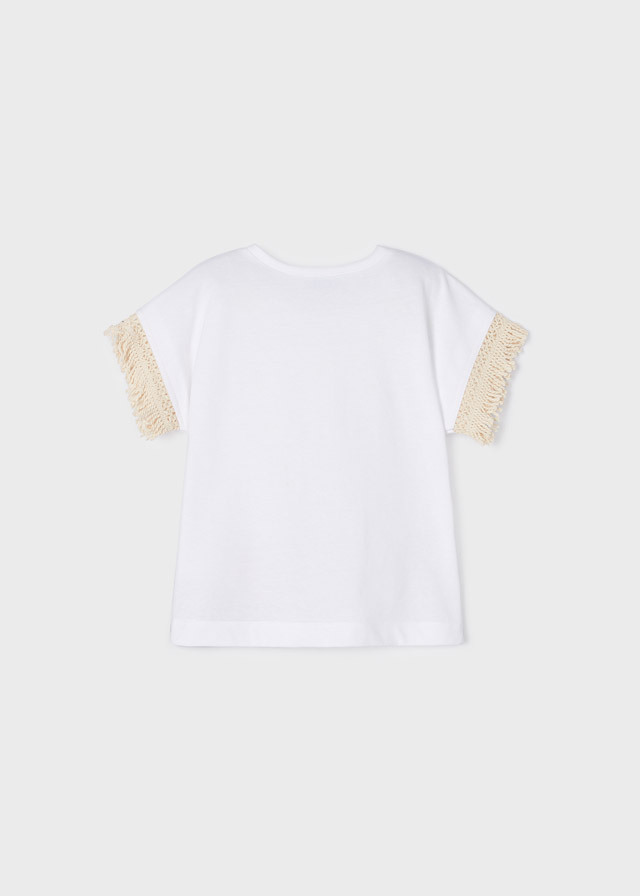 Стильная белая футболка с яркимрисунком жирава с бежевыми кружевас бахромой сделают каждый образВашей дочки особенным.
