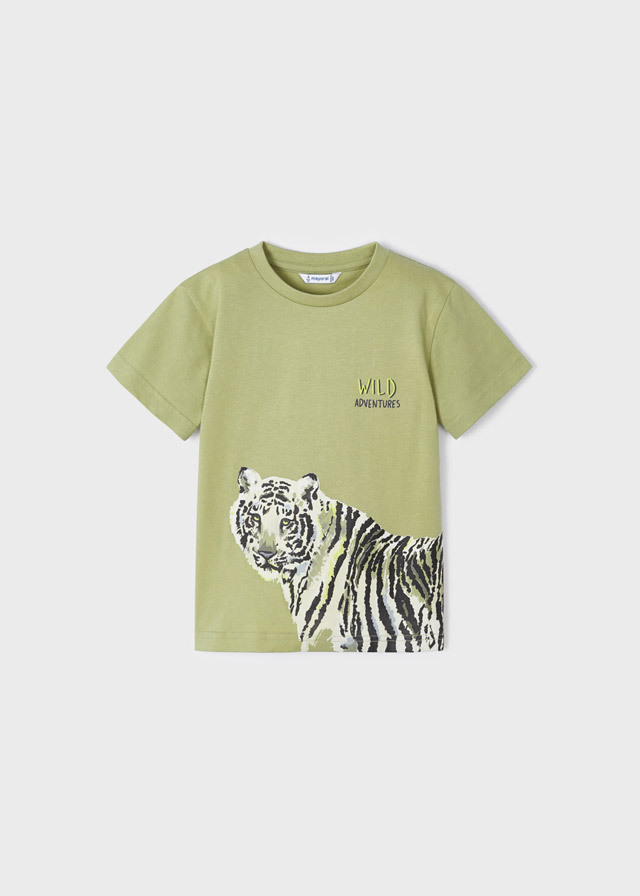 Эффектная футболка натуральногозеленого цвета с рисунком тигра точнопонравится мальчишке. Вседрузья тоже захотят такую в подарок.