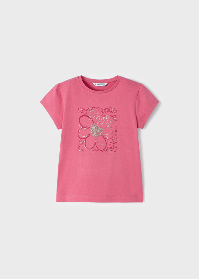 Милая футболка цвета пиона с рисункомцветочков прекрасно подойдет длялюбого времени года. Она станетнезаменимой базовой вещью вгардеробе Вашей доченьки.