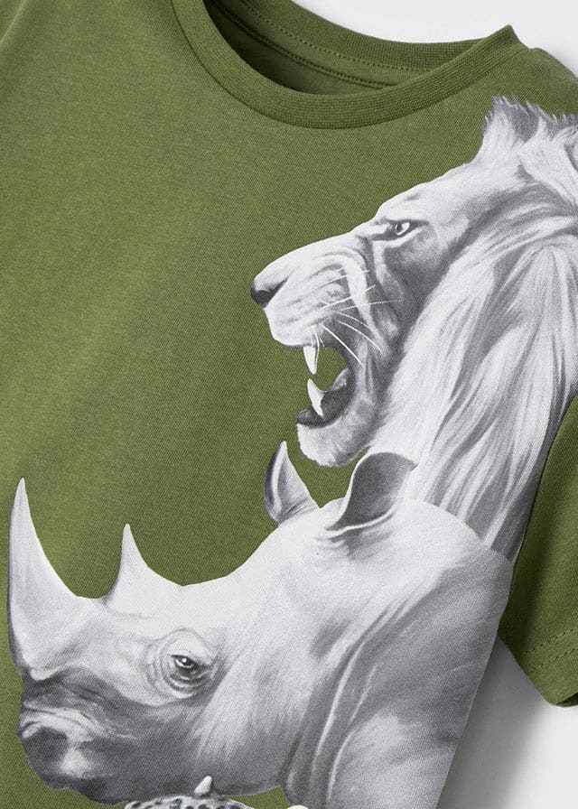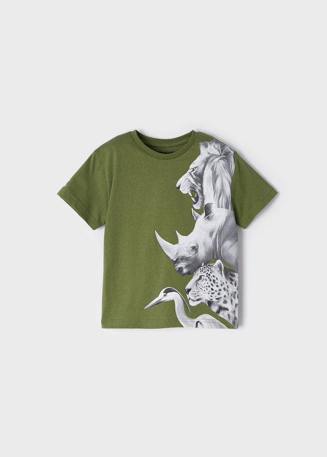 Футболка природного зеленого оттенкас изображением диких животныхобратит на себя внимание всех ребятвокруг. Вашему сыночку точно захочетсятакую классную футболку.