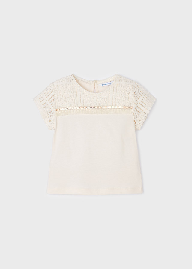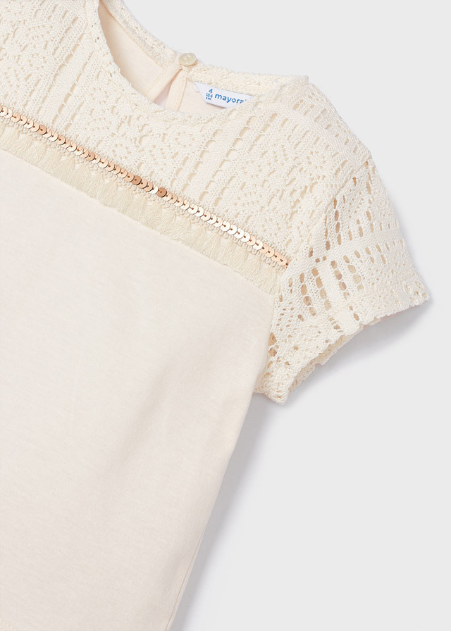 Блузка с винтажными кружевами цветашампань сделает образ дочки оченьблагородным. А пайетки на футболкемедного оттенка определеннопонравятся девочкам.