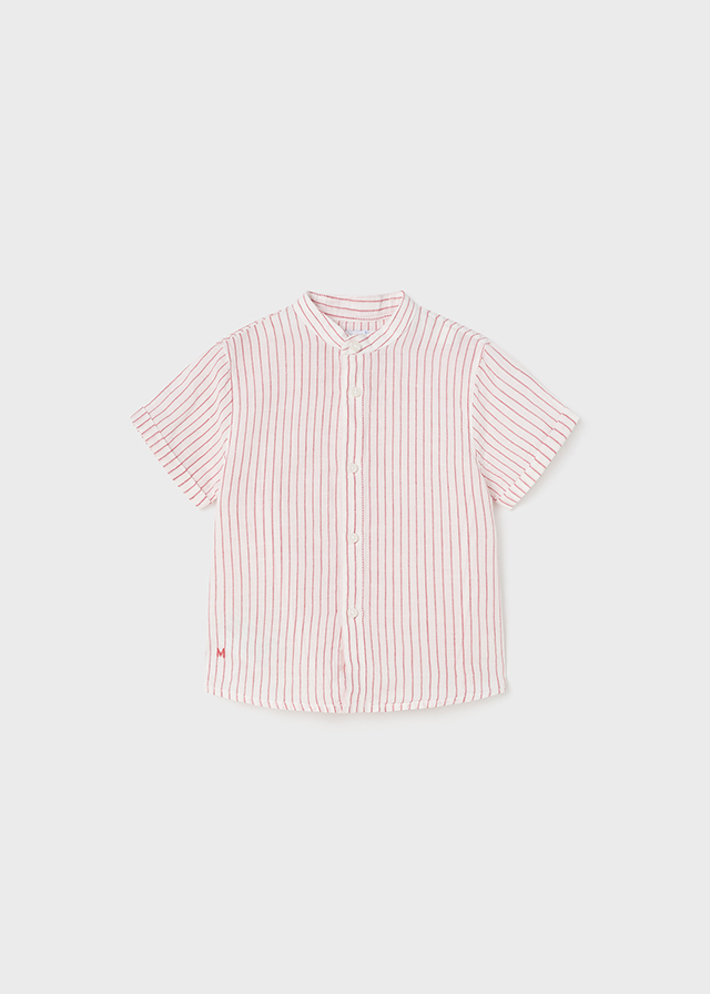 Легкая рубашка с коротким рукавомв тоненькую полоску оранжевогоцвета сделает образ Вашего малышаочень благородным. Прекрасно будетсочетаться и с брюками, и с шортами.