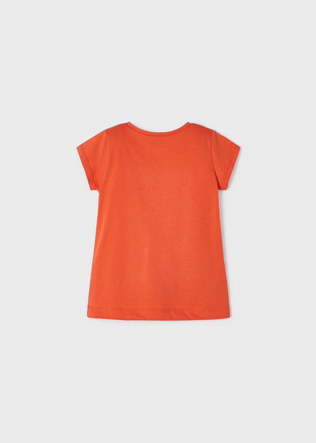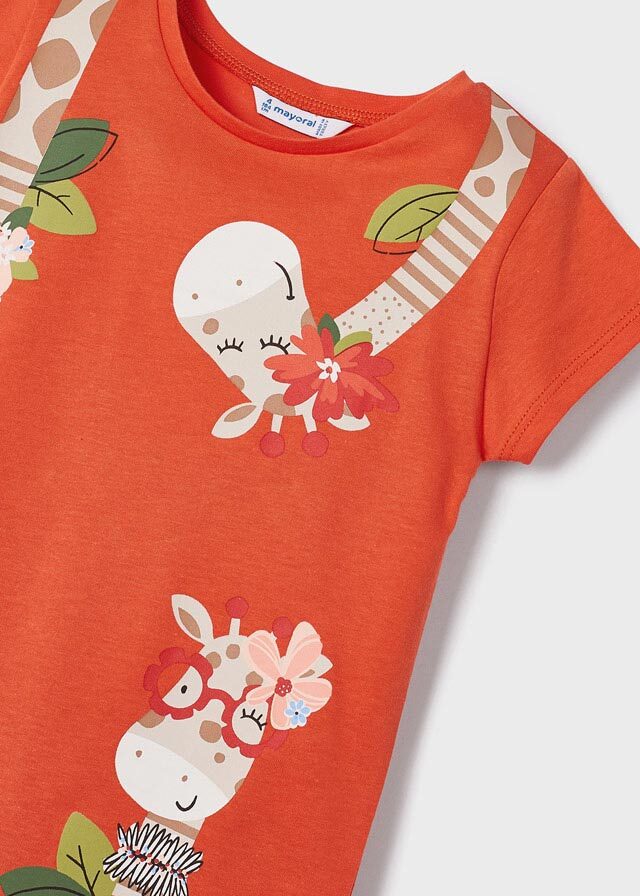 Яркая футболка красивого апельсиновогоцвета с рисунком милых жирафиковпрекрасно подойдет для летних прогулок.