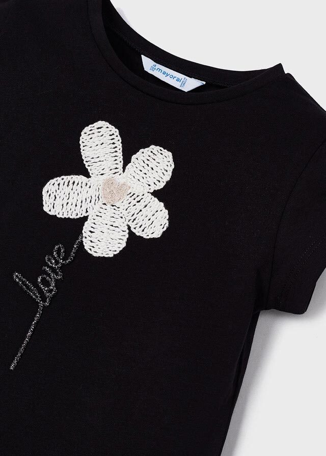Отличная базовая футболка черногоцвета с вышитой белой ромашкойстанет незаменимой детальюлетнего гардероба девочки.