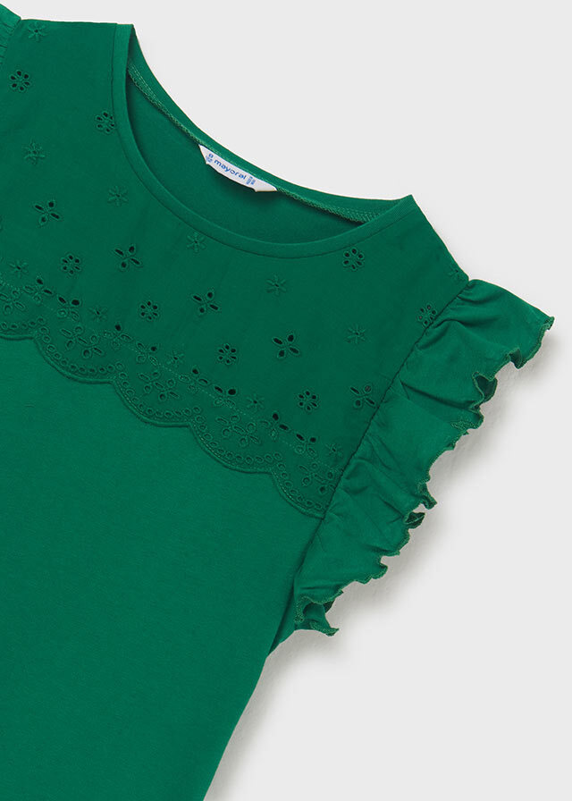 Воздушный красивый кружевной топизумрудного оттенка будет отличносочетаться и с джинсами, и с юбочкой.Кружева выглядят очень мило и стильно.