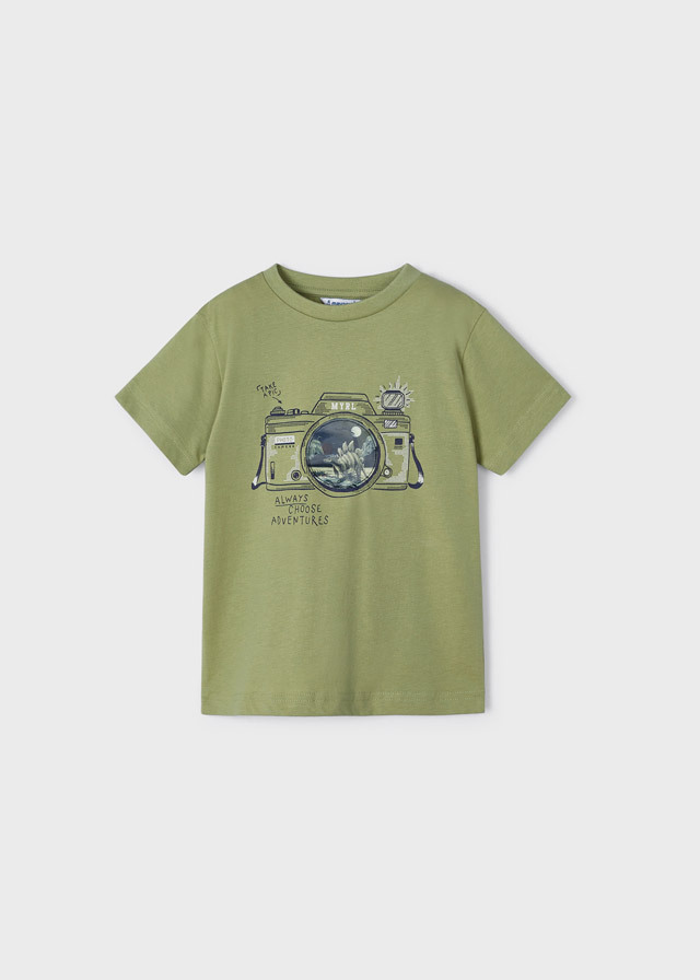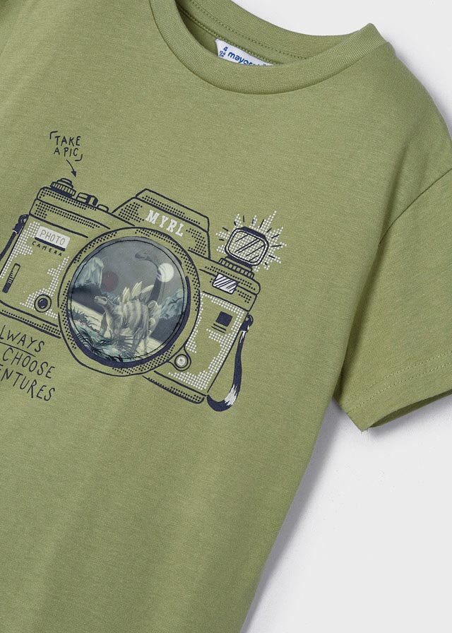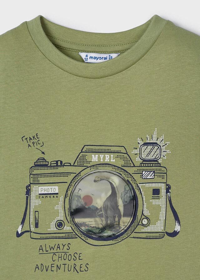 Футболка натурального зеленогооттенка с рисунком фотоаппарата,у которого меняется изображениединозавра в линзе под разным углом.Все мальчишки захотят такой подарок.