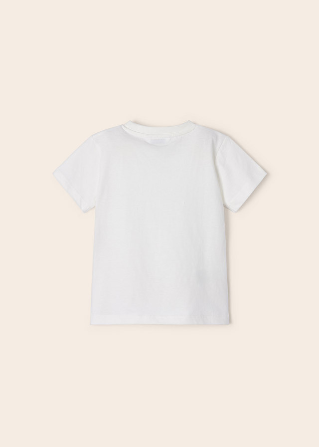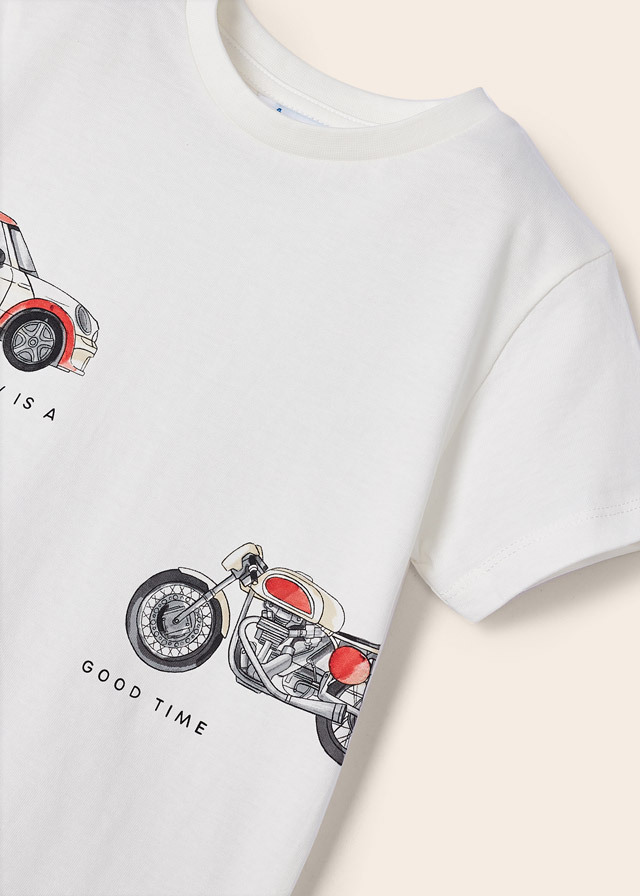 Белоснежная футболка с рисункоммотоцикла и автомобилей вызоветвосторг у мальчика. Он будет срадостью надевать ее на прогулку.