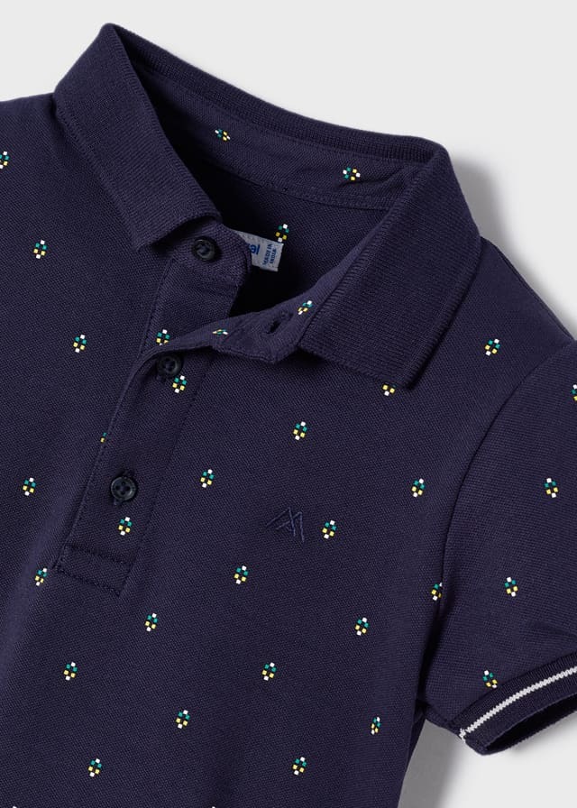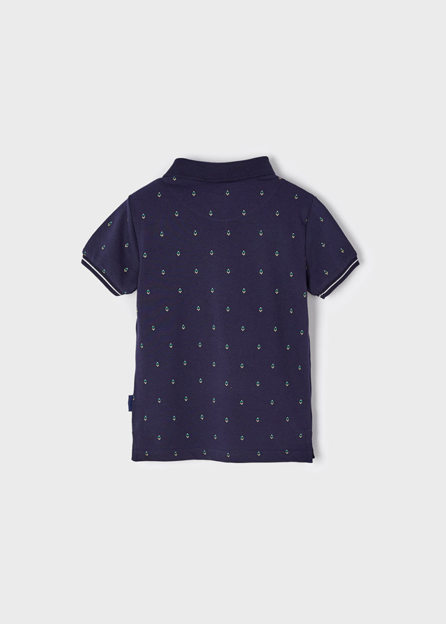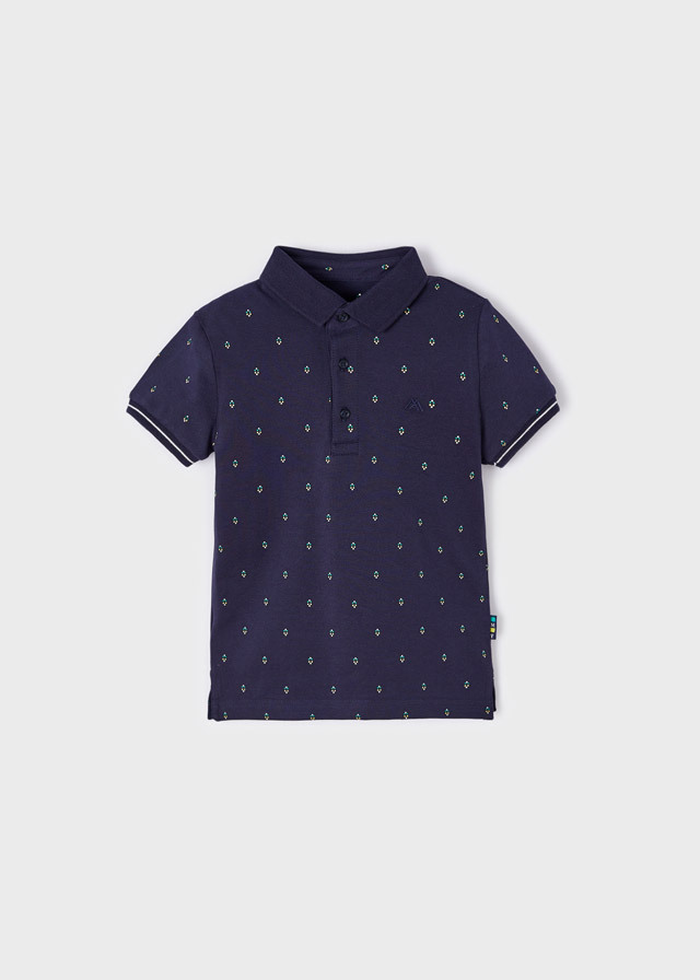 Очень комфортное поло темно-синегоцвета с мелким орнаментом станетотличной базовой вещью в гардеробеВашего мальчика.