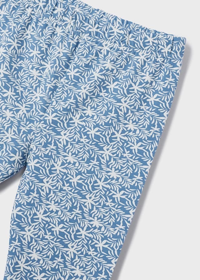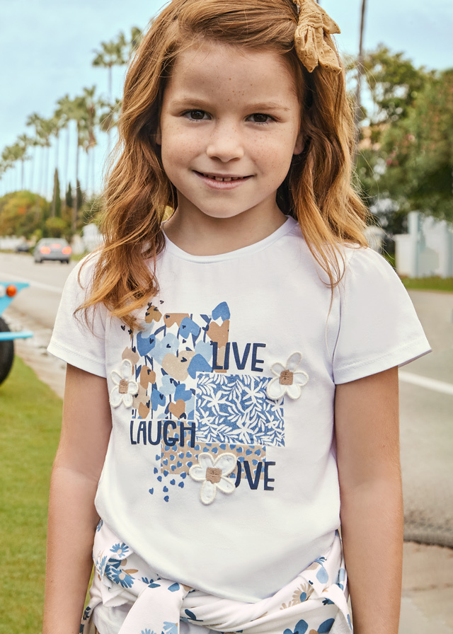 Крутой летний комплект из белойфутболки с рисунком в пастельныхтонах и пары леггинсов классныхрасцветок в тон узора на майкепомогут легко приодеть ребенка к лету.
