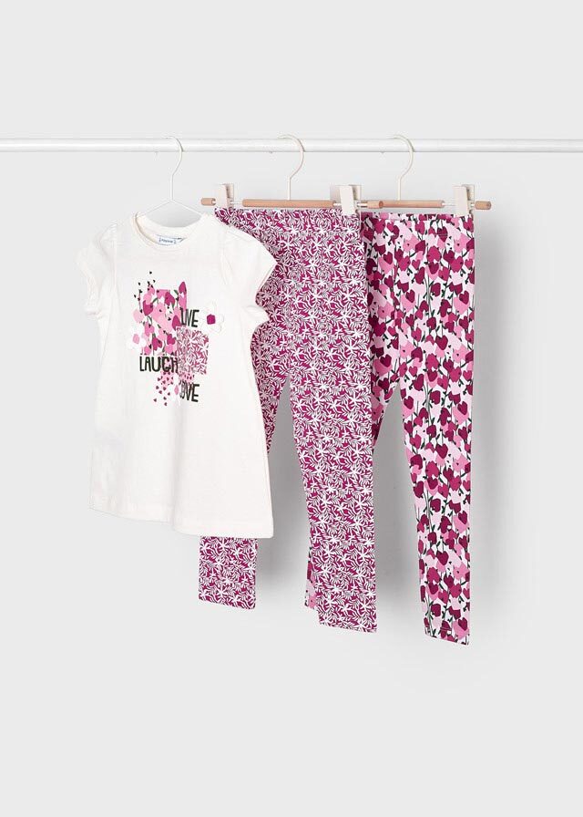Крутой летний комплект из белойфутболки с рисунком малиновогооттенка и пары леггинсов классныхрасцветок в тон узора на майкепомогут легко приодеть ребенка к лету.