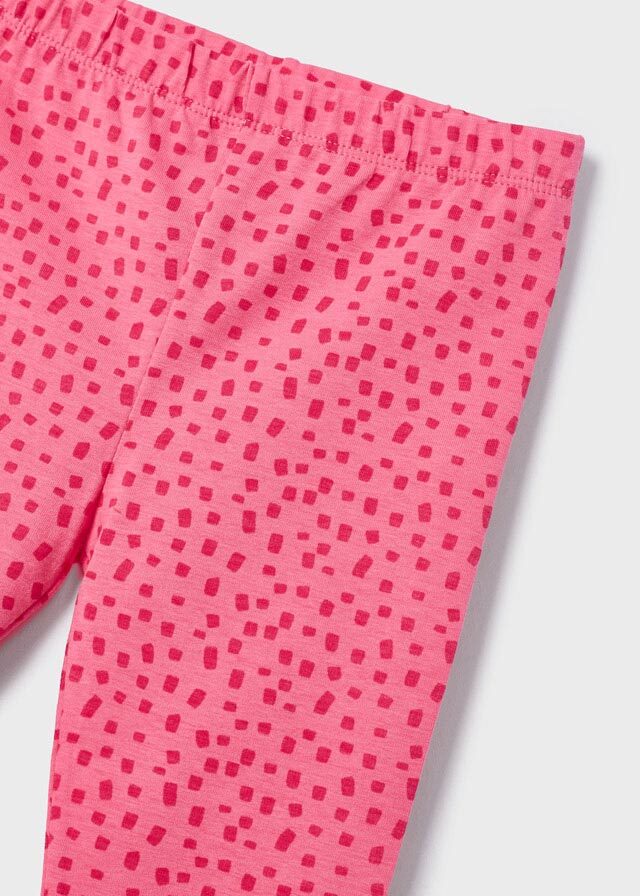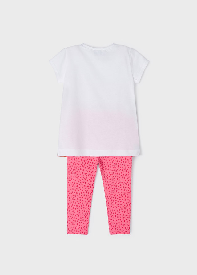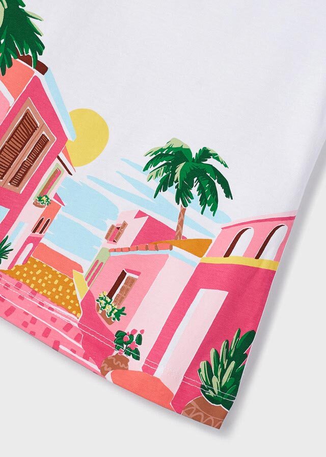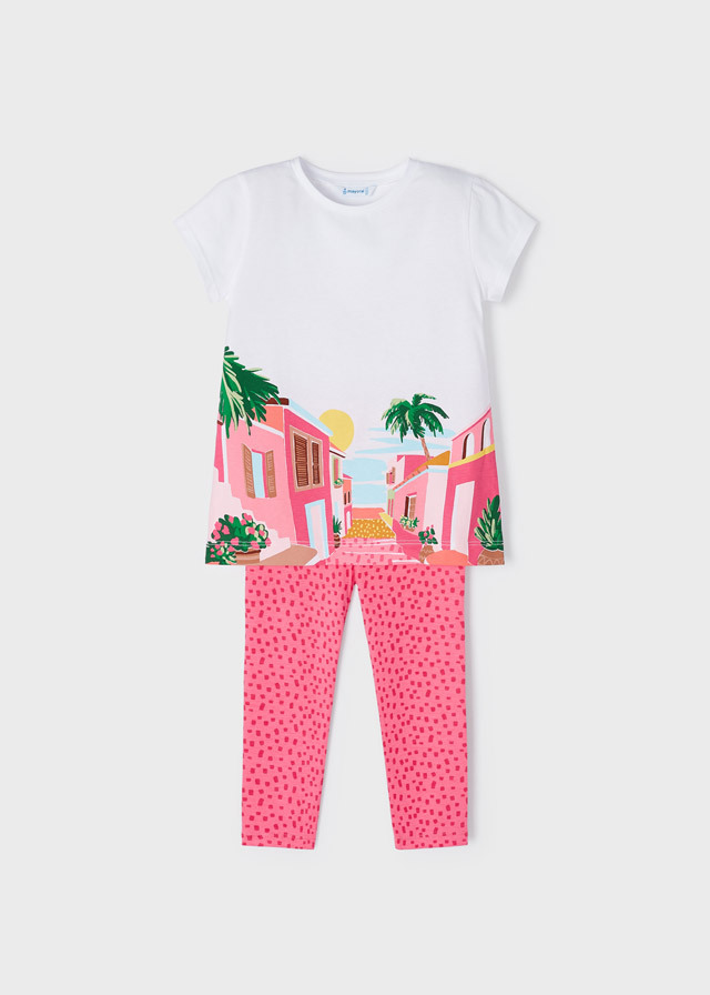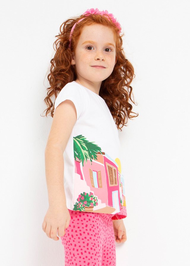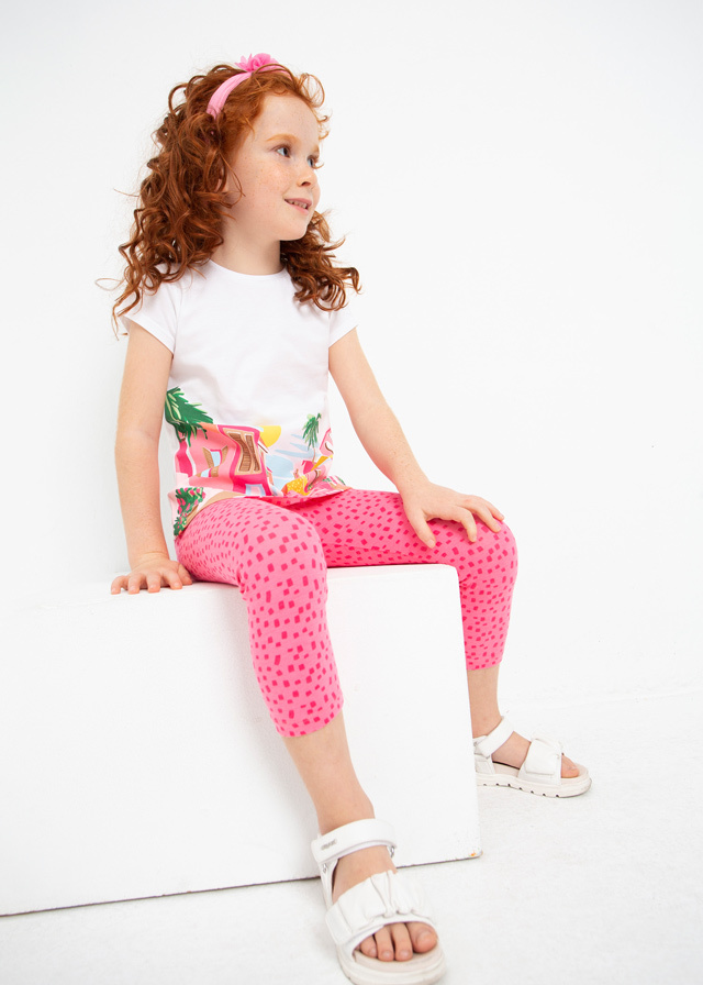 Яркий летний костюм из белоснежнойфутболки с рисунком курортногогородка с леггинсами насыщенногорозового цвета выделит Вашу дочкуна фоне остальных.