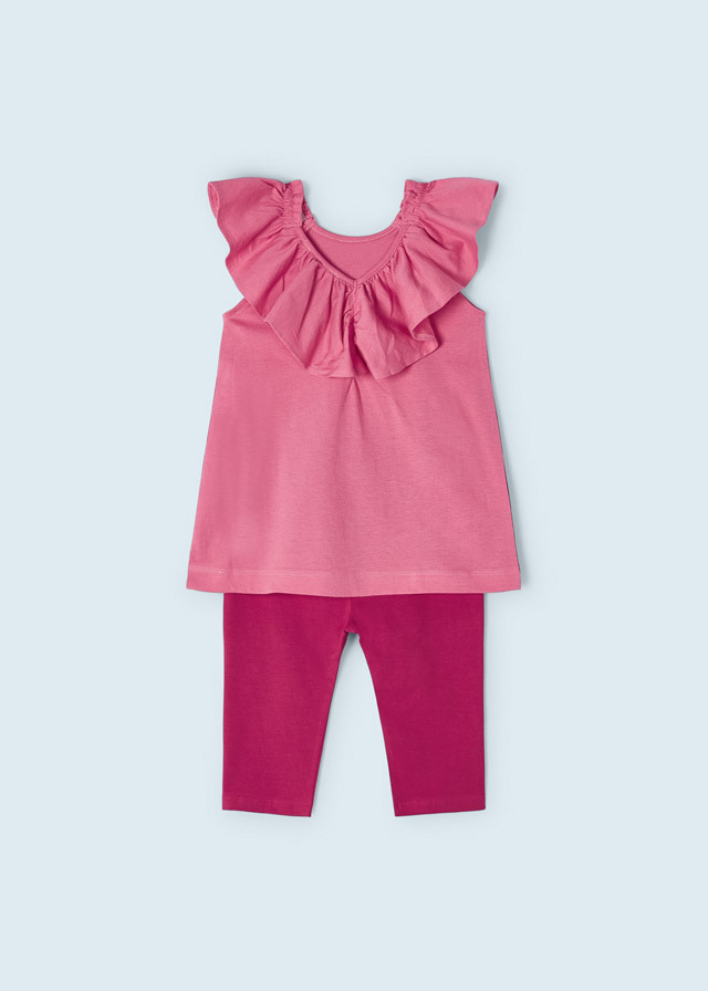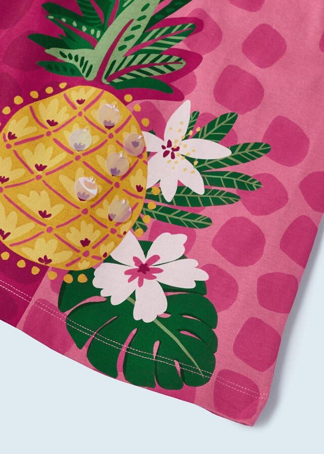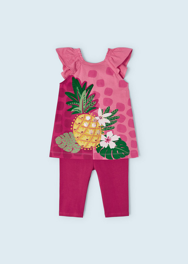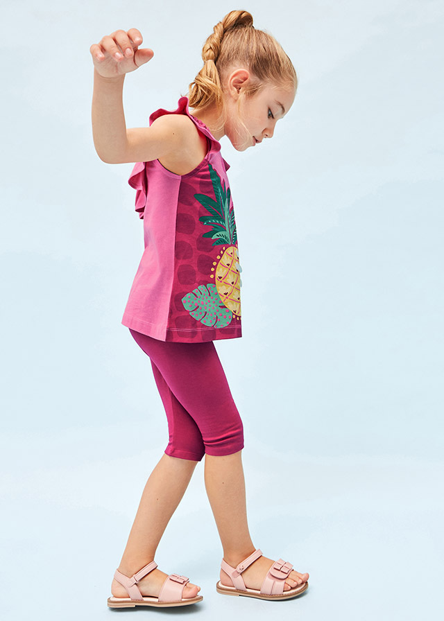 Сочный комплект из малиновойфутболки с рисунком спелогоананаса и укороченных леггинсовтакого же цвета выручит Вас с дочкойв жаркую погоду.