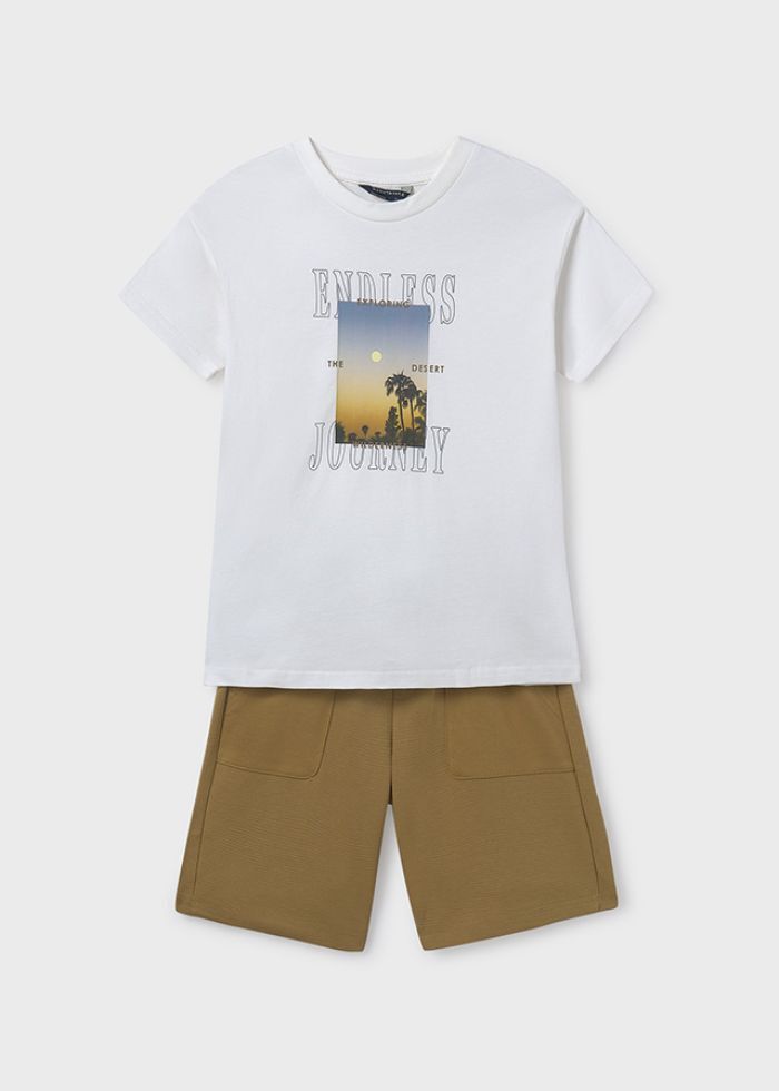 Отличный комплект для мальчикаиз объемной футболки и удобныхтрикотажных шорт идеально подойдетдля летних прогулок.