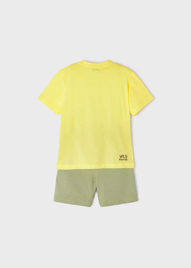 Красивый комплект из футболкиприятного желтого оттенка с рисункомкрокодила и зеленых трикотажныхшорт прекрасно подойдет сыночкудля прогулок.
