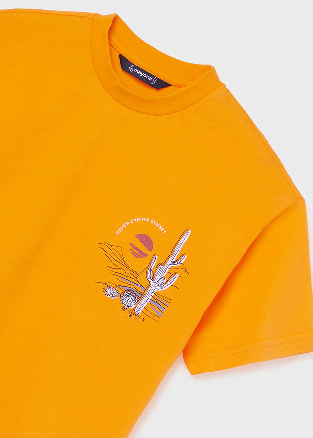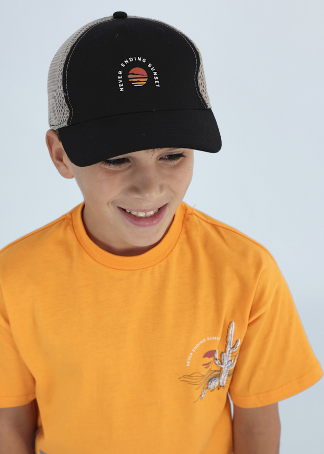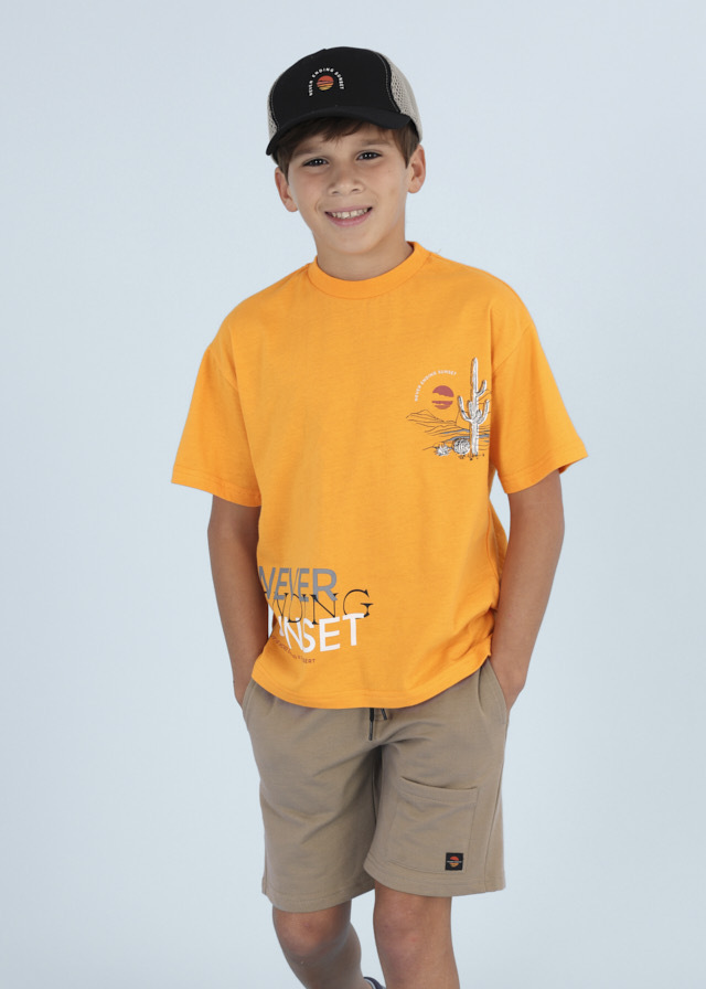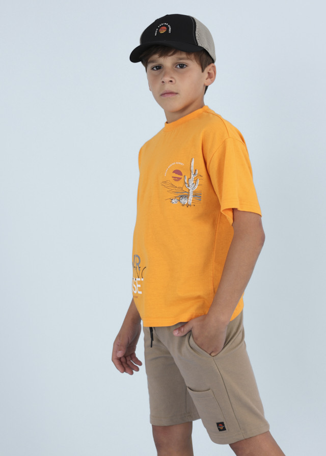 Отличный комплект для мальчикаиз яркой оранжевой футболки, бежевыхшорт и графитовой бейсболки идеальноподойдет для летних прогулок испортивных игр.