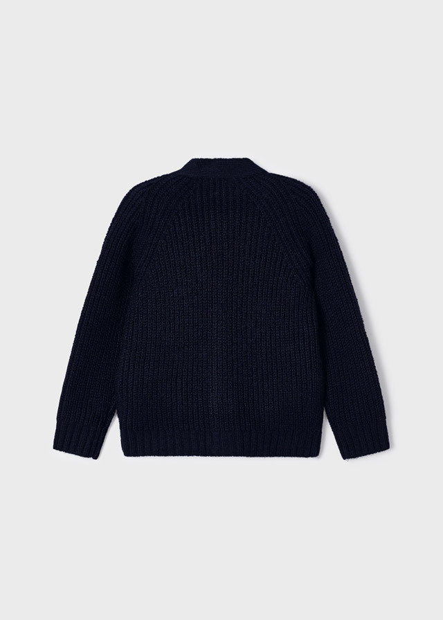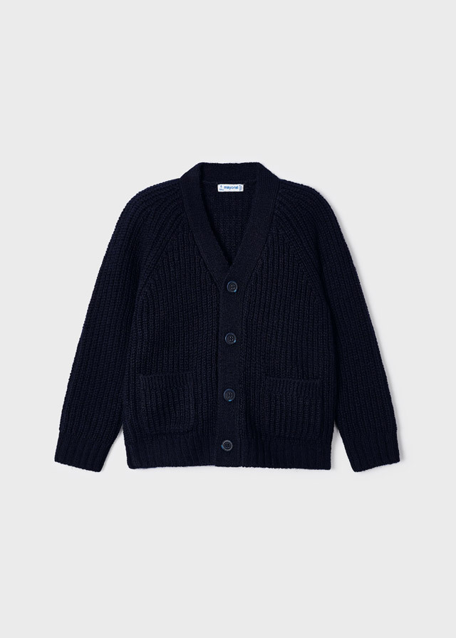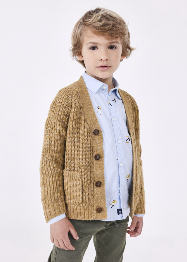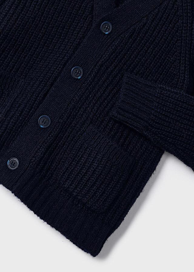 Элегантный синий кардиган крупнойвязки согреет Вашего мальчика холоднойосенью и зимой. Он будет отличносмотреться как с водолазкой, так и срубашкой, делающей его подходящимдаже для школы.