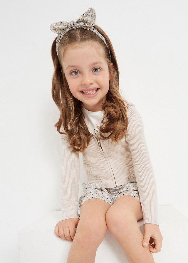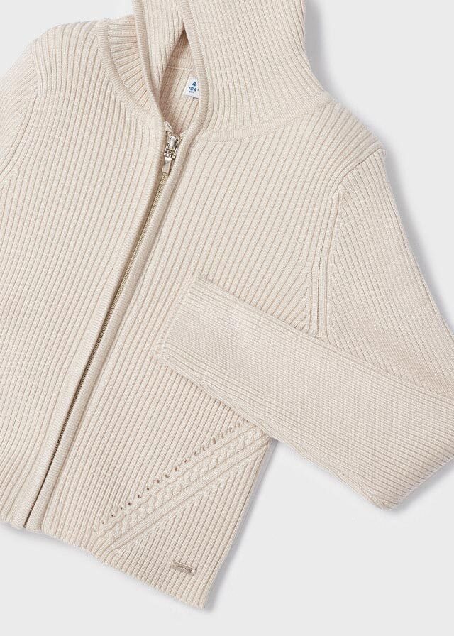 Очень мягкая трикотажнаякофта на молнии кремовогооттенка в рубчик согреет летнимивечерами. У кофточки естькапюшон.