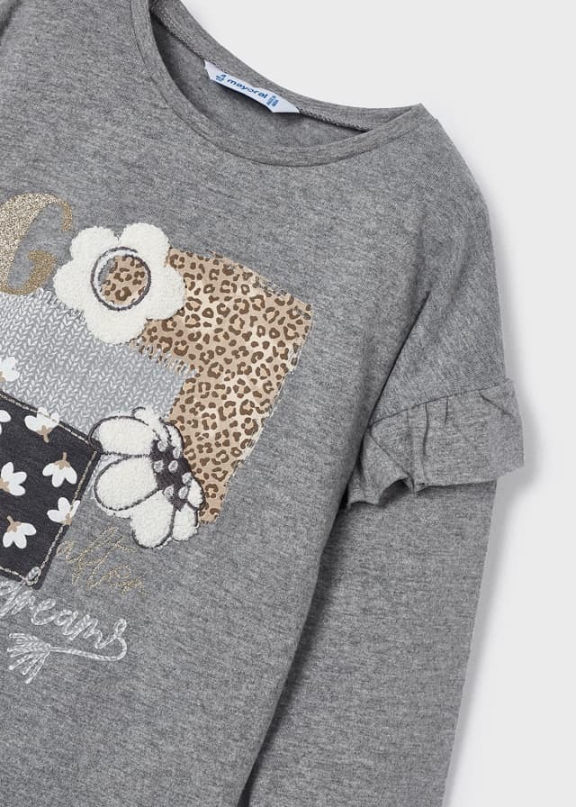 Стильная трикотажная кофта стальногоцвета с рисунком на груди и рюшамина рукавах подойдет на любой сезон.Ее можно надеть и на прогулку, ив детский сад или в школу под жакет.