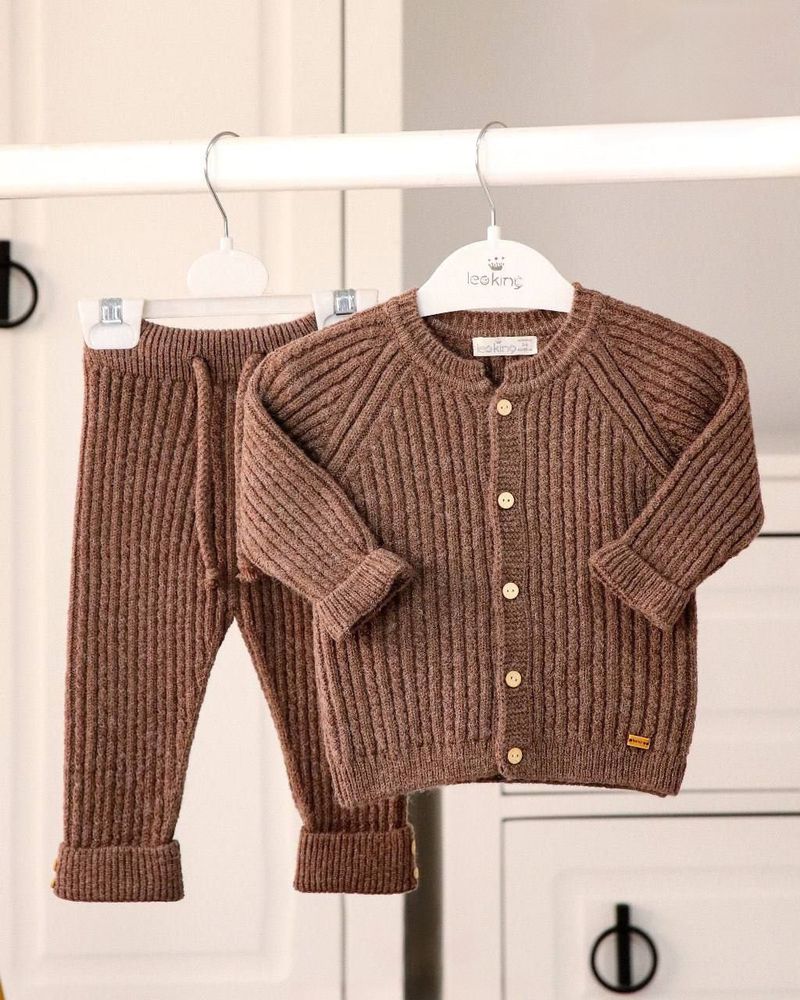 Модный трикотажный костюм для малышашоколадного оттенка станет любимым вгардеробе Вашего малыша. Он оченьудобный и теплый, что так важнов наступающие холода.