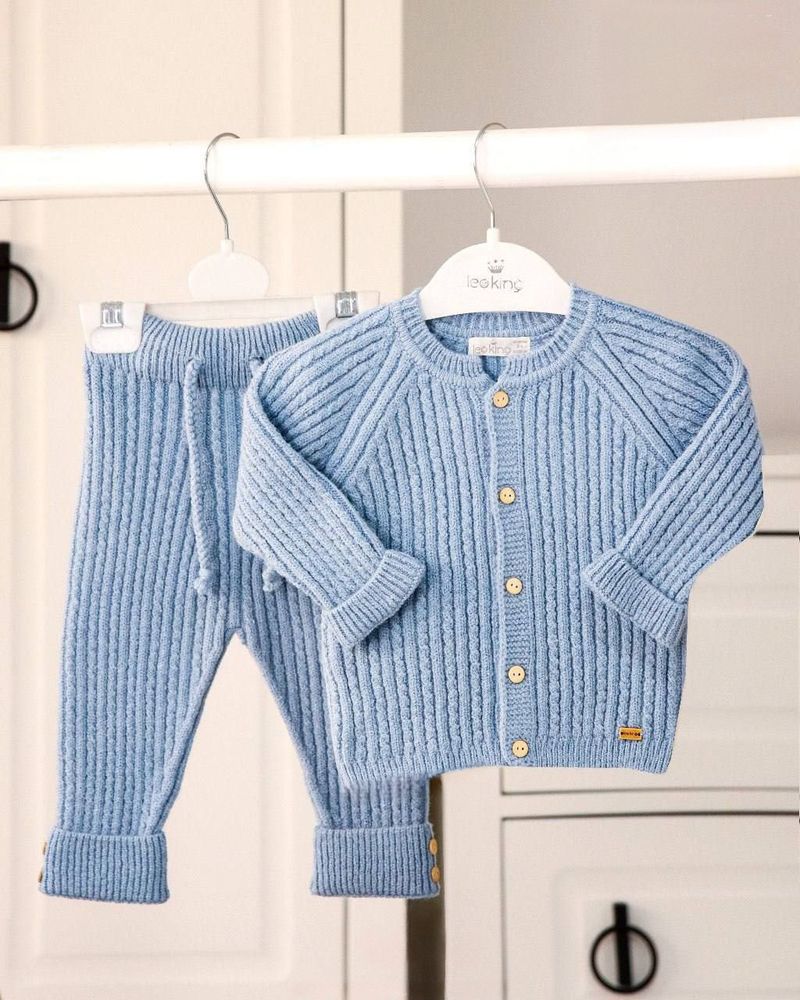 Модный трикотажный костюм для малышанебесного оттенка станет любимым вгардеробе Вашего малыша. Он оченьудобный и теплый, что так важнов наступающие холода.