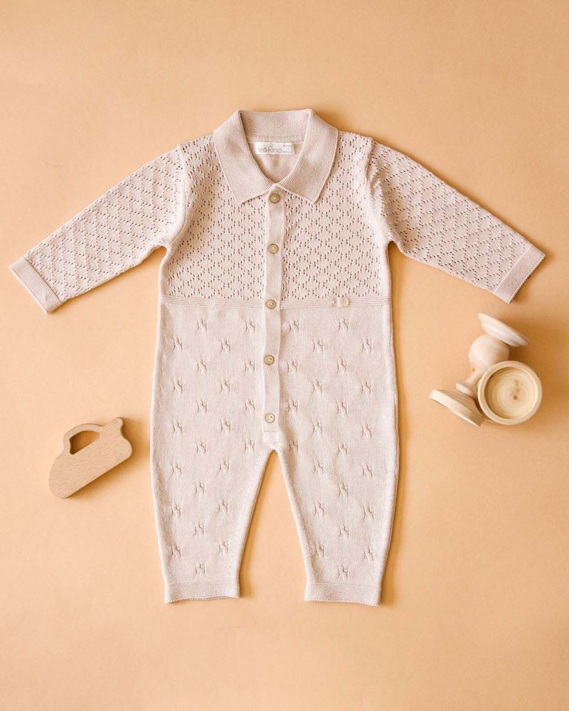 Невероятно милый трикотажный комбинезондля Вашего малыша из 100% хлопка никогоне оставит равнодушным. Натуральныйбежевый оттенок, воротник-поло, в меруажурная отделка сделают из мальчикамаленького денди.