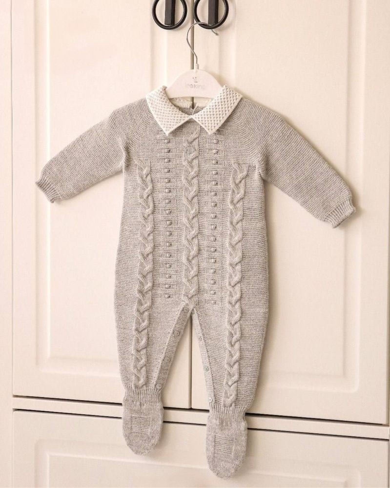 С таким элегантным комбинезоном серогооттенка и белым воротником Ваш мальчикбудет самым настоящим джентельменом.Теплый и очень мягкий наряд согреетмалыша в любую непогоду.