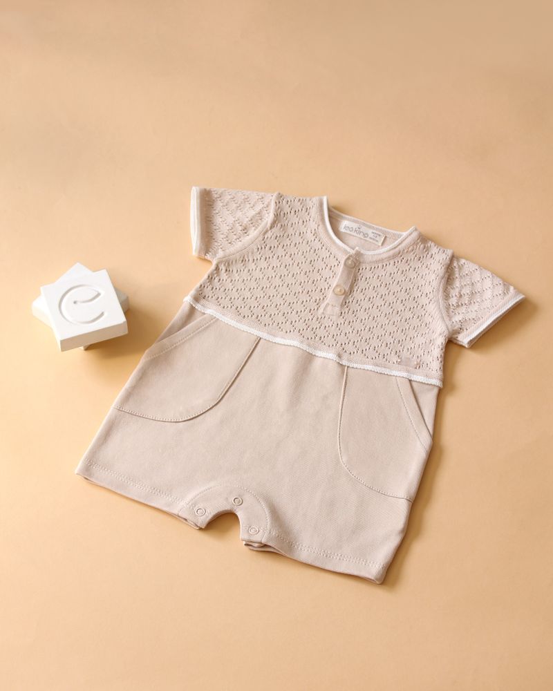 Невероятно милый трикотажный комбинезондля Вашего малыша из 100% хлопка никогоне оставит равнодушным. Натуральныйбежевый оттенок, кармашки, в меруажурная отделка сделают из мальчикамаленького денди.