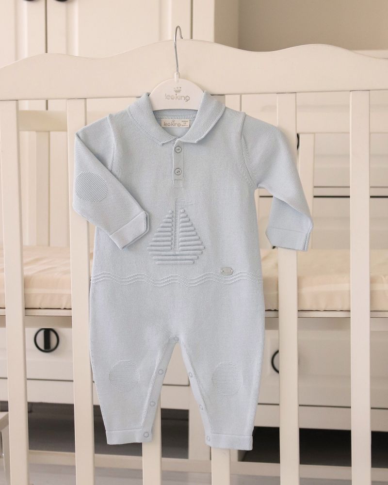 Классный трикотажный комбинезон дляВашего малыша из 100% хлопка никогоне оставит равнодушным. Благодаряприятному голубому оттенку, воротнику-поло и декора парусной лодки костюмстанет отличным подарком сыночку.