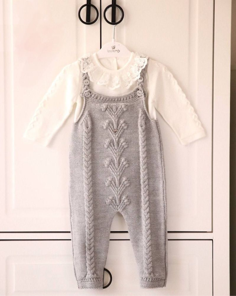 Теплый комбинезон приятного серогооттенка с объемным узором с бодимолочного цвета с белоснежнымворотничком из кружева подойдет дляяслей и на праздник. Кофточка выполненаиз 100% хлопка.