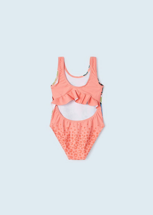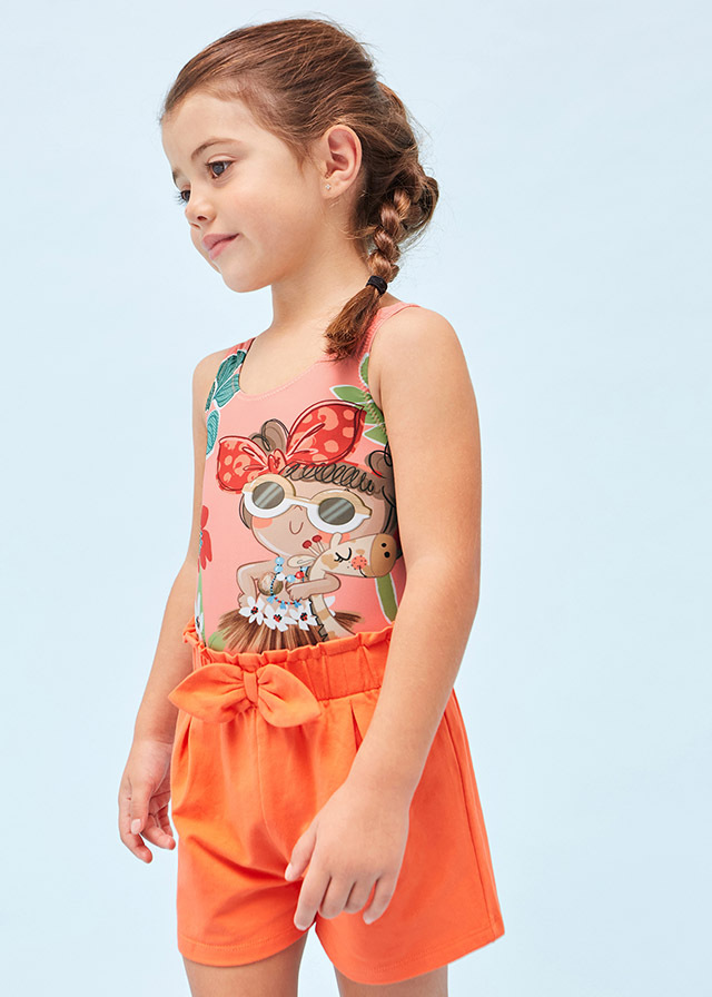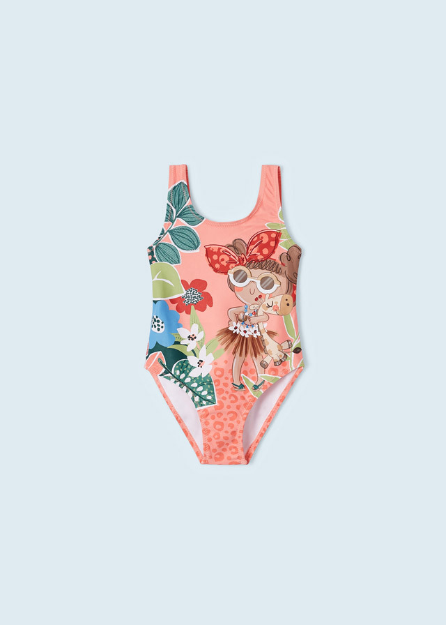 Красивый персиковый купальникс веселым рисунком будет выделятьсяна фоне остальных. Все фотографиис отдыха будут безумно красочными исочными.
