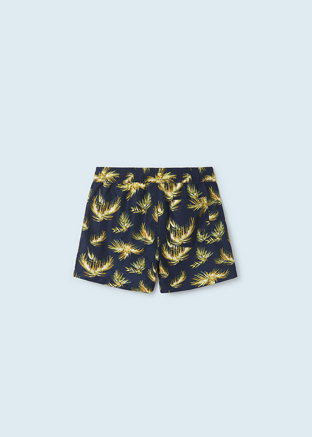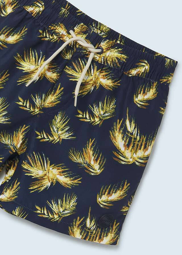 Очень удобные пляжные шортыглубокого синего цвета срисунком пальмовых ветвейотлично подойдут подростку дляплавания и спортивных игрна берегу.
