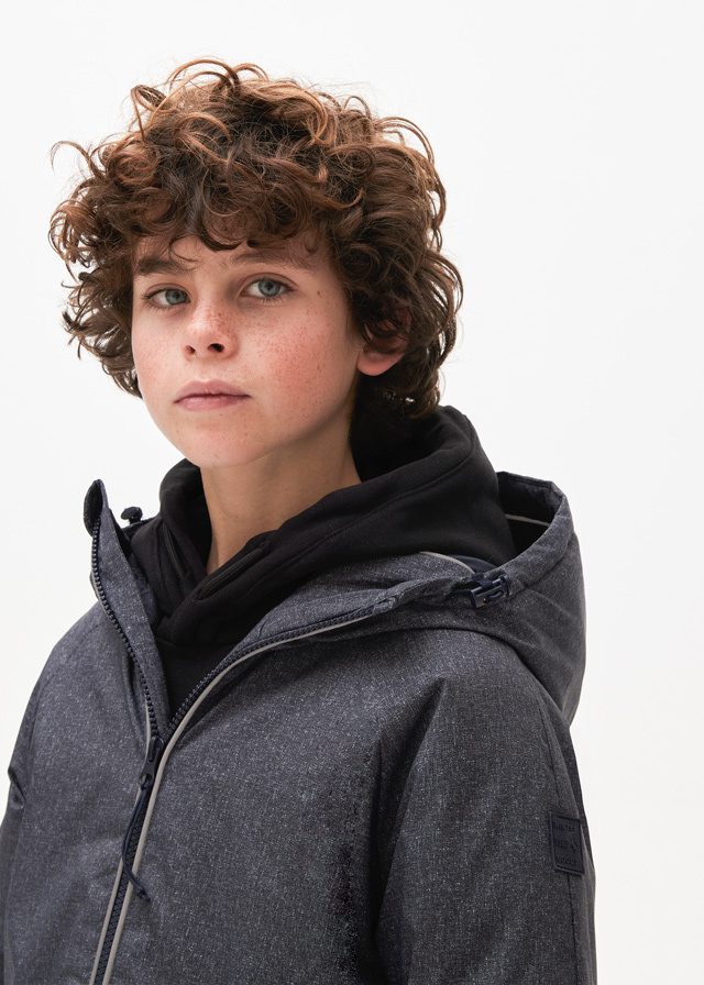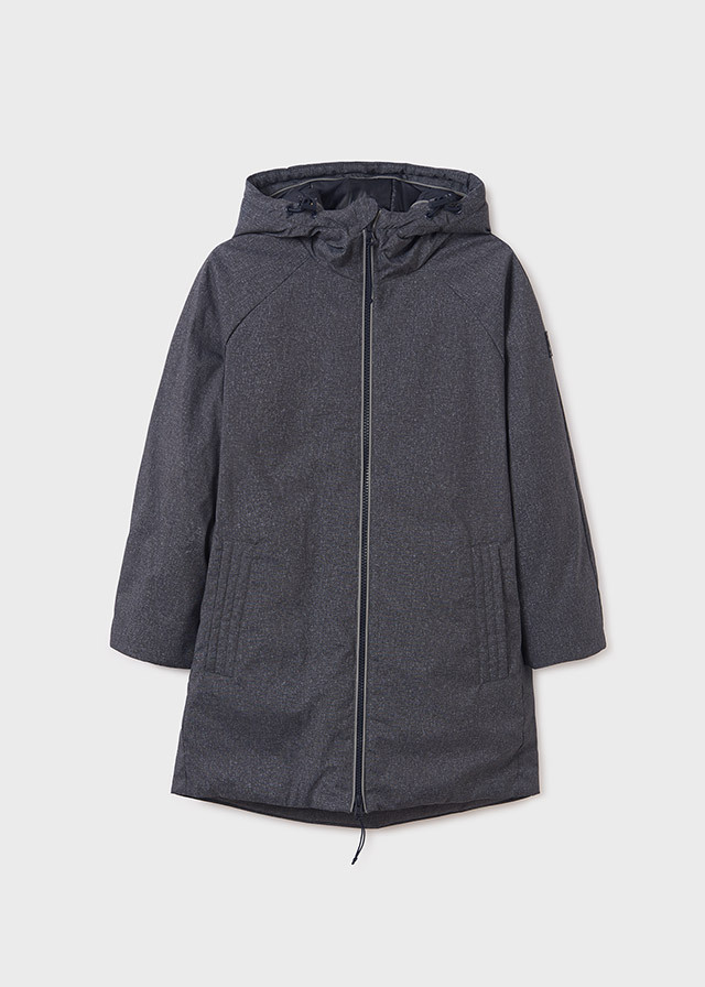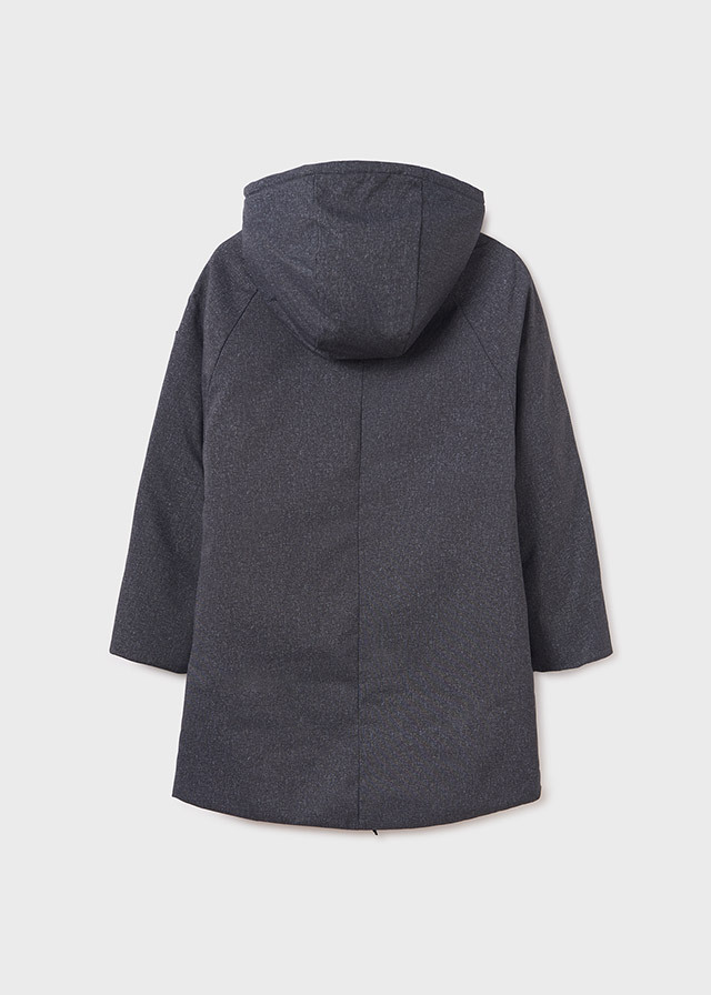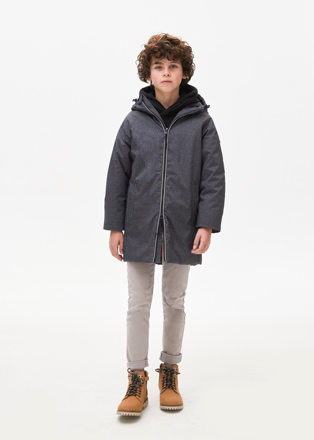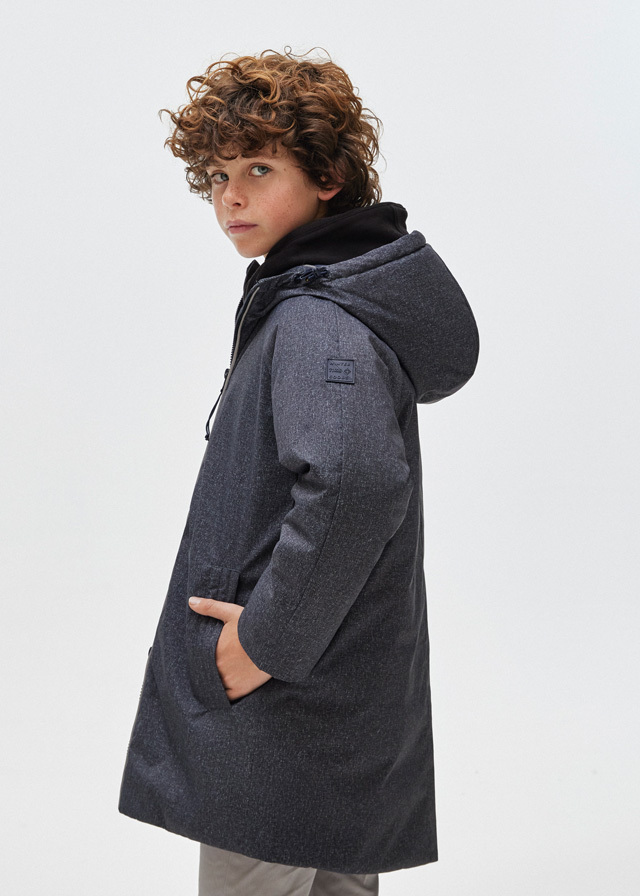 Элегантная удлиненная курткас капюшоном для мальчикасогреет в холодную погоду.Классический строгий фасони серый цвет будут вместеотлично сочетаться и дополнятлюбой наряд для прогулки илишколы.