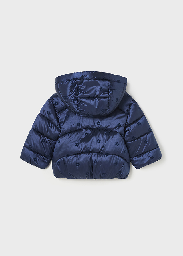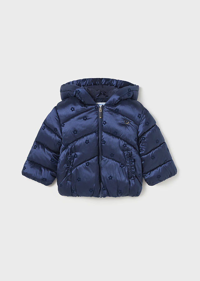 Красивая куртка с капюшономглубокого синего цветас эффектом глянца и бархатнымимилыми цветочками станетидеальной верхней одеждой.