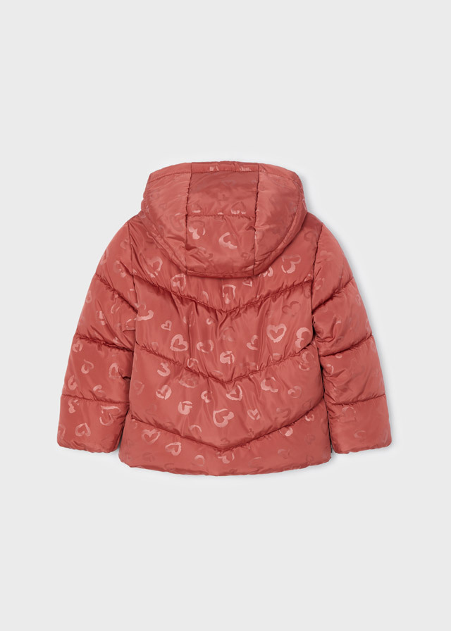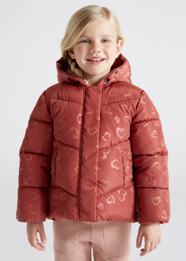 Милая и веселая теплая курткас капюшоном терракотового цветас орнаментом в виде сердечеквсегда поднимет настроение Вами Вашей дочке в холодную погоду.