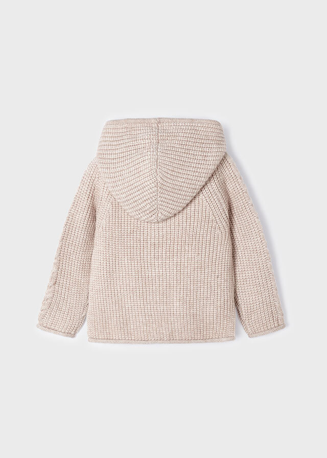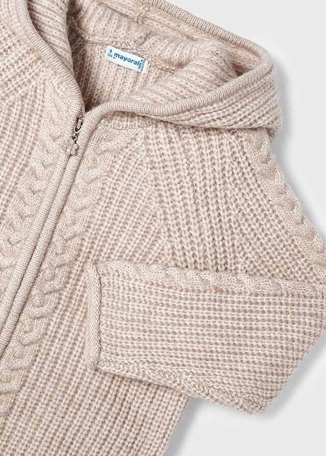 Вязаная куртка с капюшоном на молниипрекрасно подойдет для осени и весны,а также для летних вечеров. Бежевыйцвет будет прекрасно сочетаться с любымпредметом гардероба.