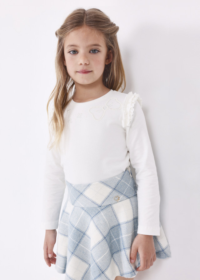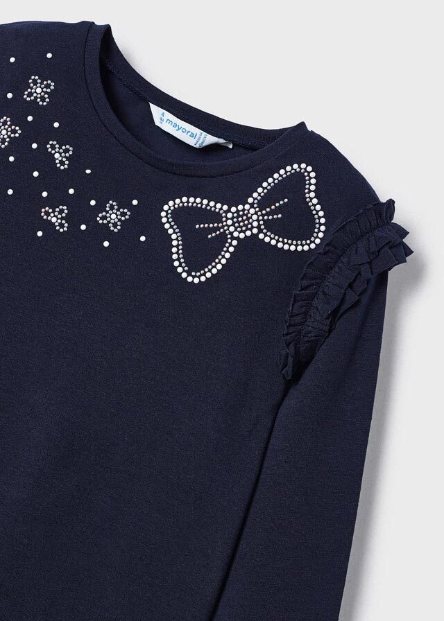 Легкая кофта глубокого синего цветасо слегка декорированным верхомподойдет на любой сезон. Ееможно надеть и на прогулку, ив детский сад или в школу под жакет.