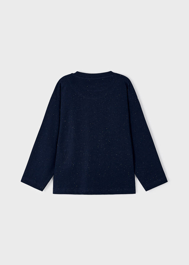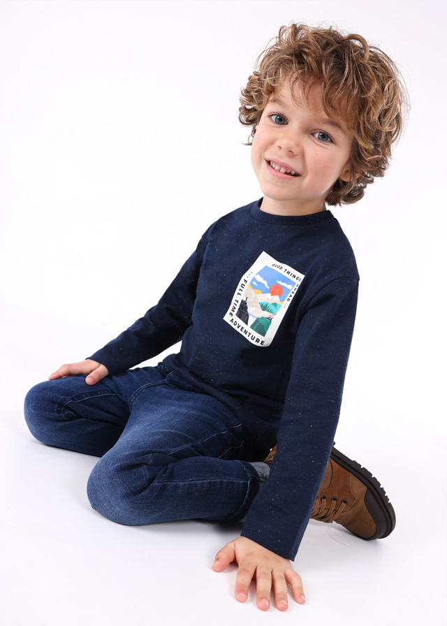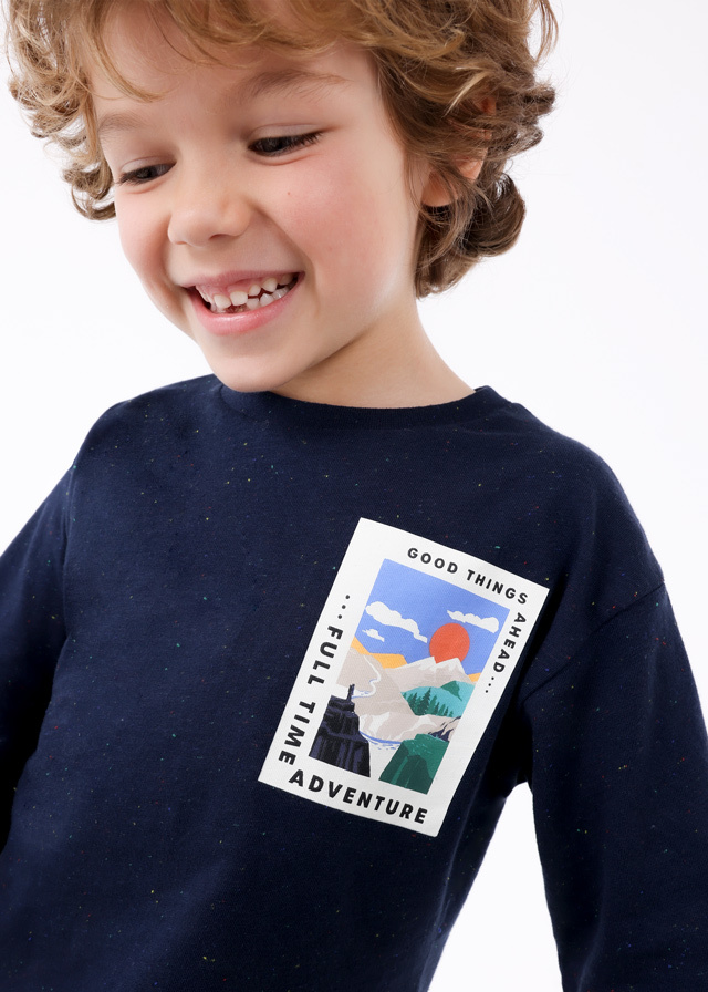 Мягкая трикотажная кофта для мальчиковтемно-синего цвета с изображениемяркого горного пейзажа. Лонгсливвыполнен в цветную крапинку, чтопозволит его удачно сочетать слюбыми брюками или джинсами.