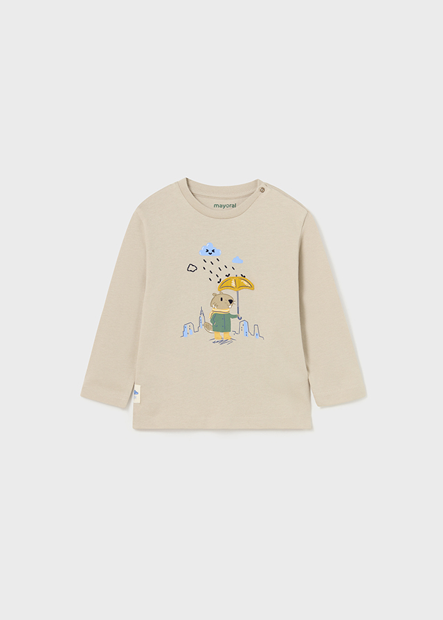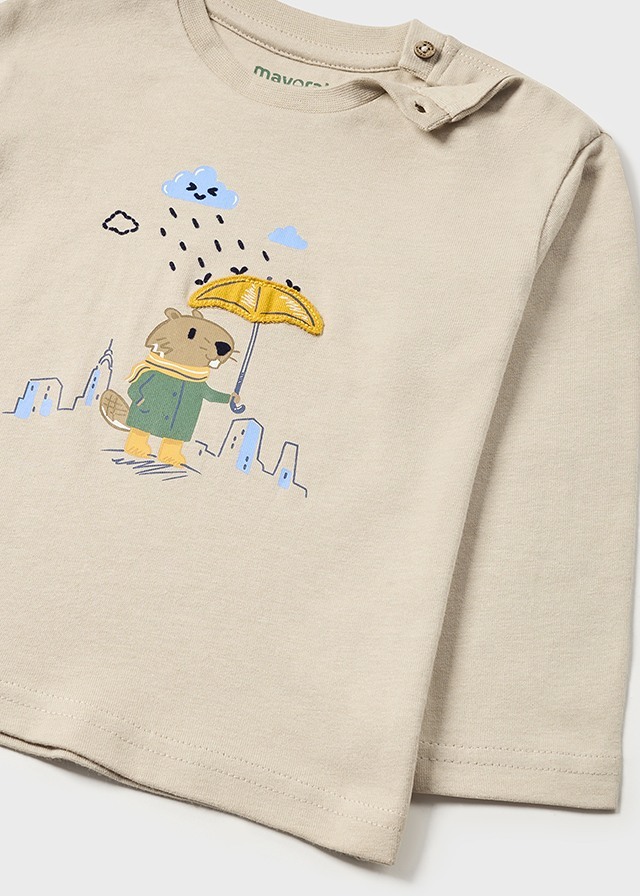 Бежевый мягкий и очень милый лонгсливвыручит Вас на любой случай. Пуговичкина плече помогут его легко надеть намалыша. А забавный рисунок сусликас зонтом вызовет улыбку у мальчика.