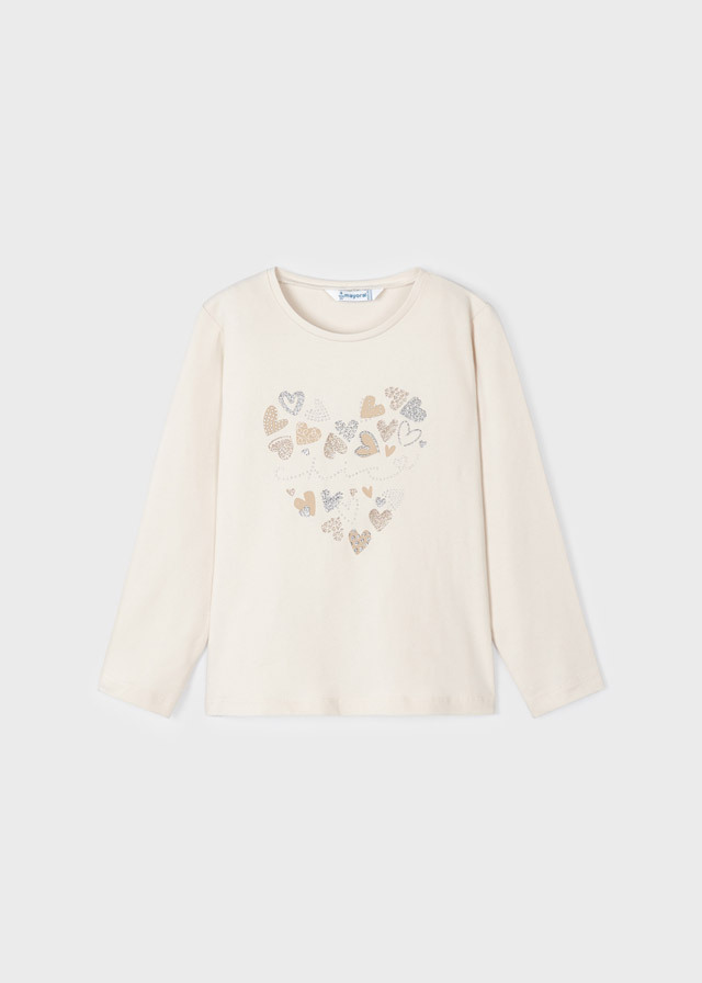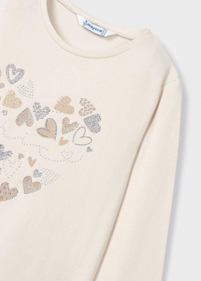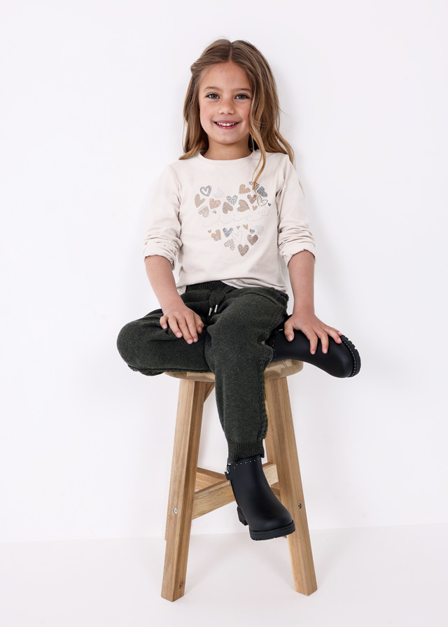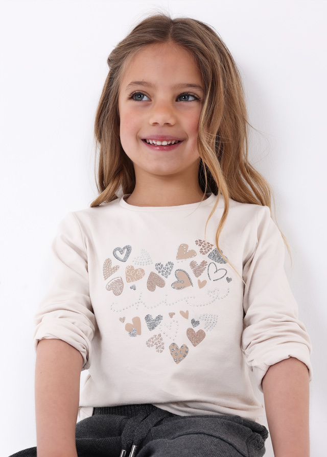 Легкая кофта молочного цветас декорированными сердечками подойдет на любой сезон. Ееможно надеть и на прогулку, ив детский сад или в школу.