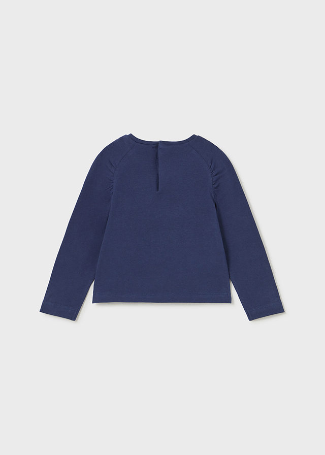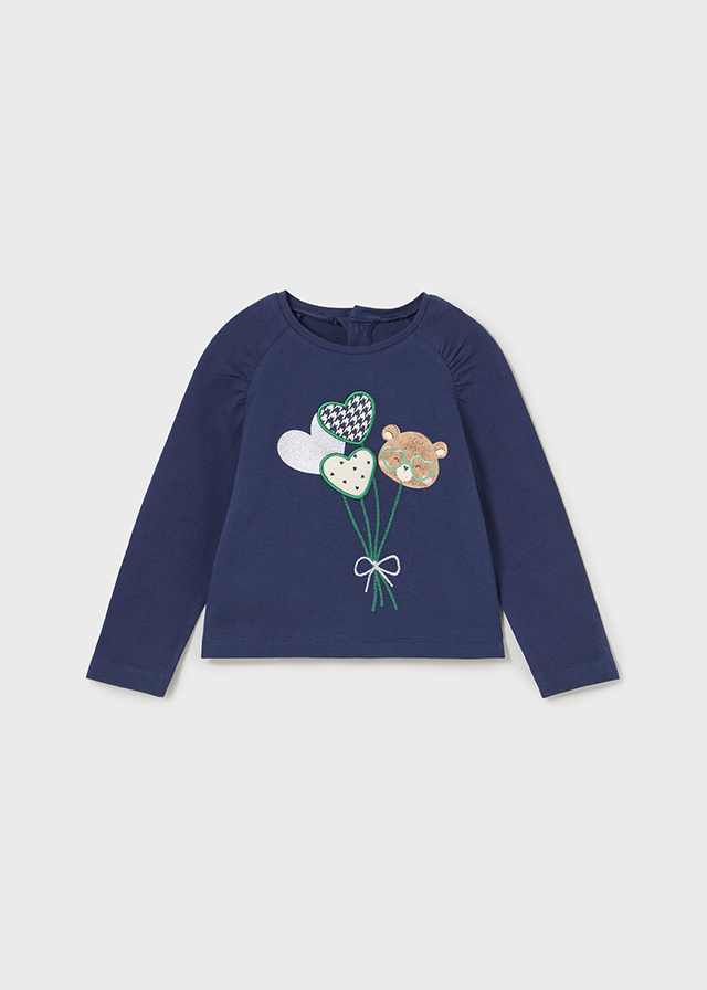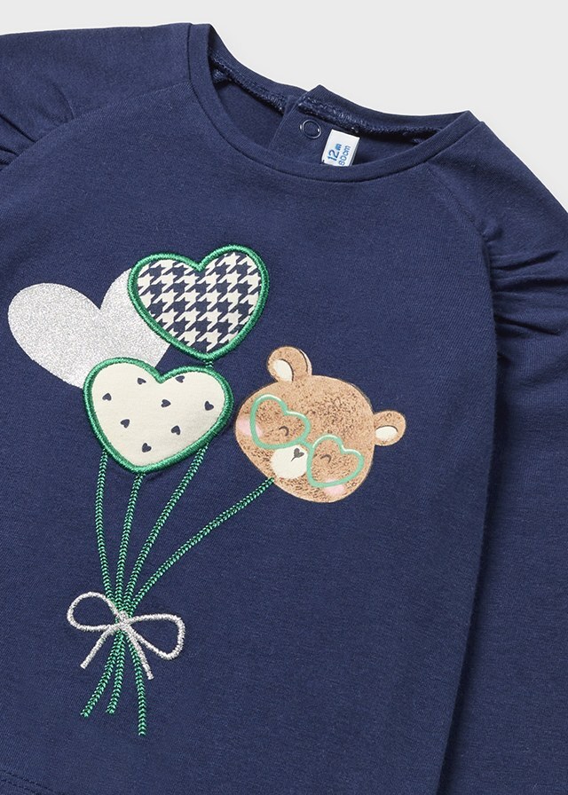 Чудесный лонгслив темно-синего цветас рисунком шариков в виде сердечек имедвежонка точно понравится Вашейдочке. Кофта очень приятная к телу иотлично подойдет на каждый день.