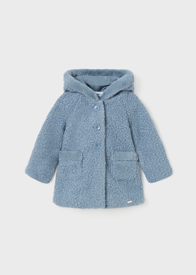 Безумно красивое и элегантноепальто с капюшоном для девочекнебесного цвета. Ваша дочкабудет в нем как маленькая леди.Декорированные мехом кармашкии капюшон смотрятся оченьстильно и эффектно.