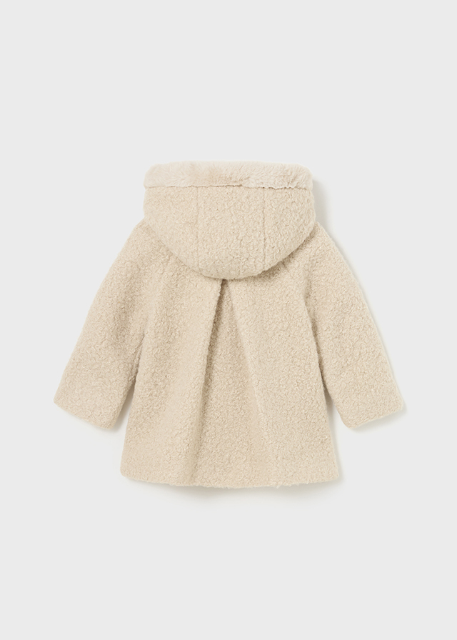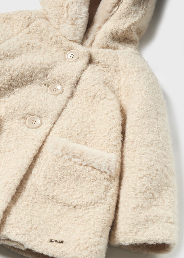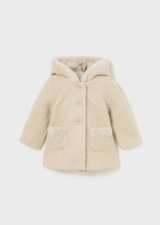 Безумно красивое и элегантноепальто с капюшоном для девочекбежевого цвета. Ваша дочкабудет в нем как маленькая леди.Декорированные мехом кармашкии капюшон смотрятся оченьстильно и эффектно.